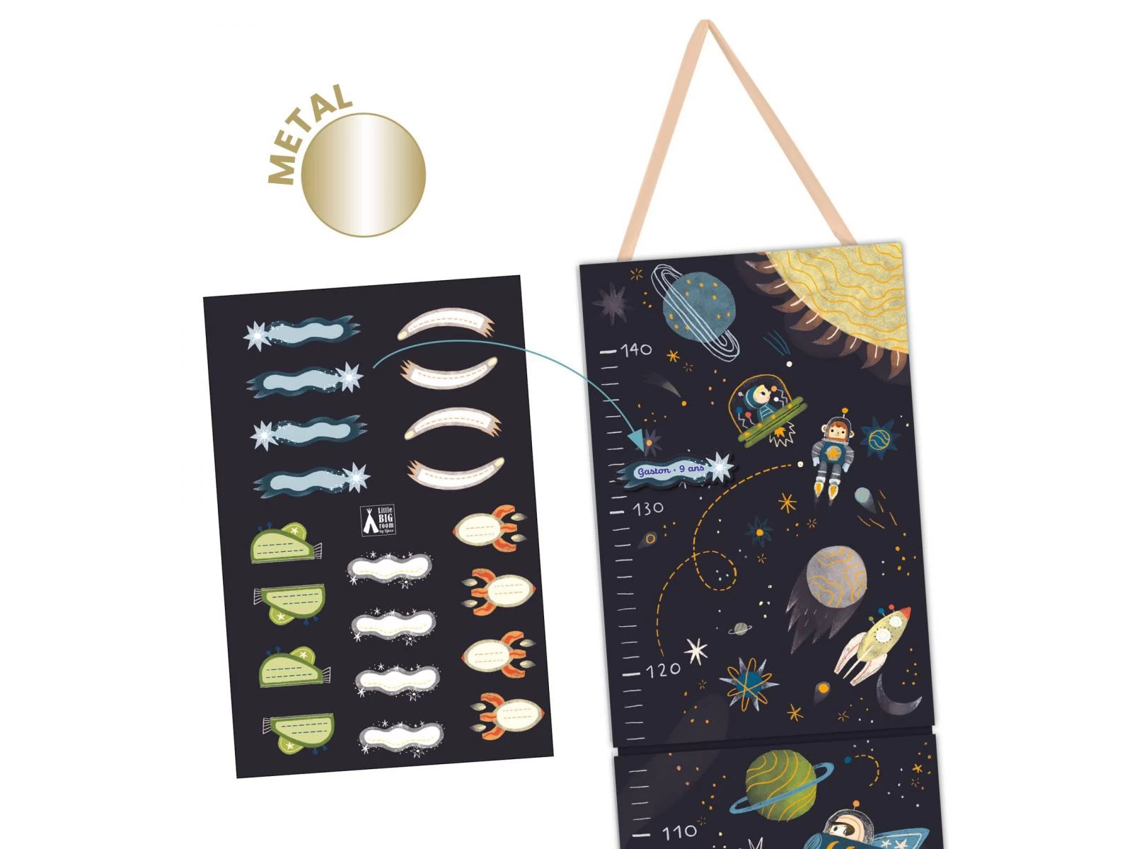 Une grande toise murale avec de nombreux stickers repositionnables sur le thème de l’espace. Un bel objet de décoration idéal pour mesurer les enfants au fil du temps (jusqu’à 1,40 m). Et lorsque l’enfant est grand, on la range dans sa jolie boite pour un tendre souvenir.