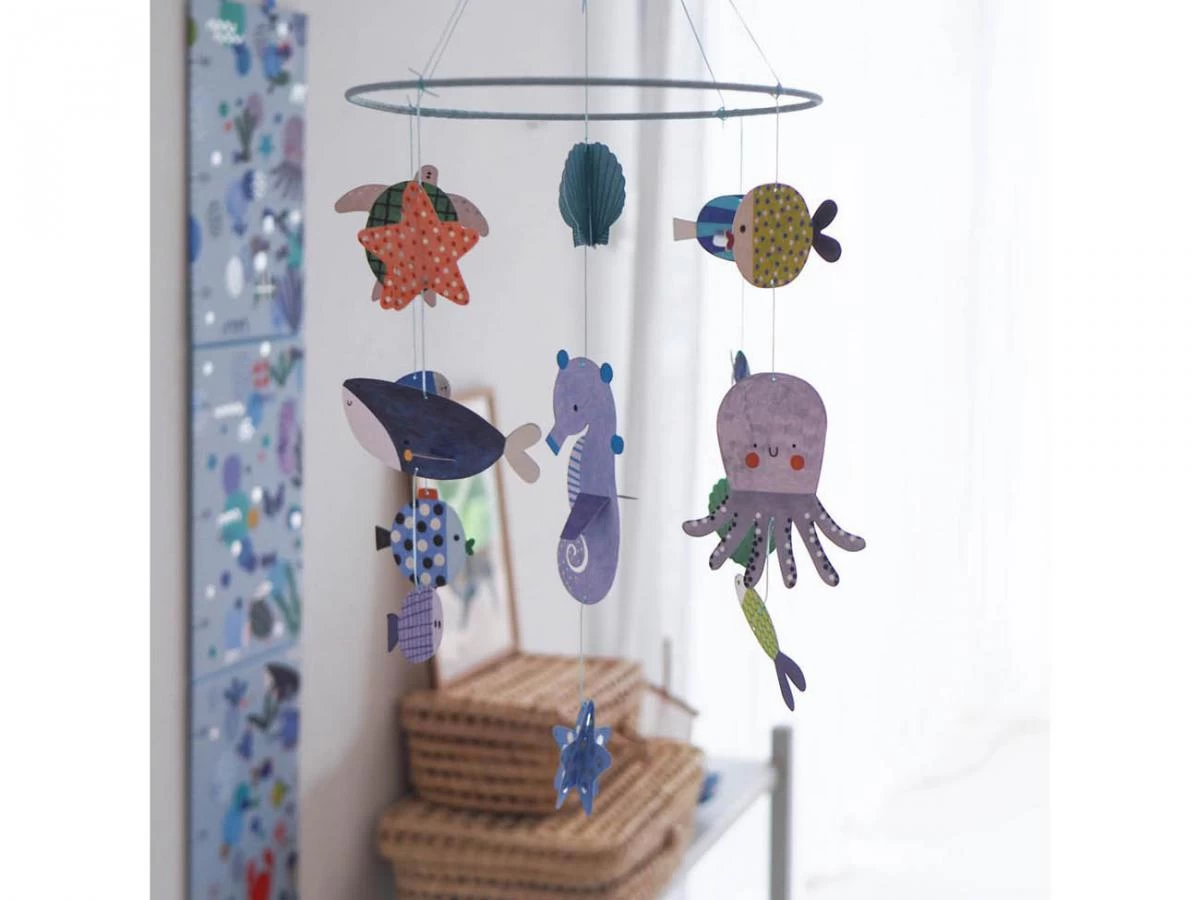 Plongez à la découverte du monde aquatique avec ce mobile sur le thème de la mer. Un bel objet pour décorer une chambre d’enfant. Déjà assemblé, il n’y a plus qu’à le fixer et admirer les éléments dans les airs. La collection Djeco Mobiles, une rencontre poétique et aérienne entre deux mondes, le design et l’illustration. Un subtil jeu d’équilibre entre rêve et réalité.