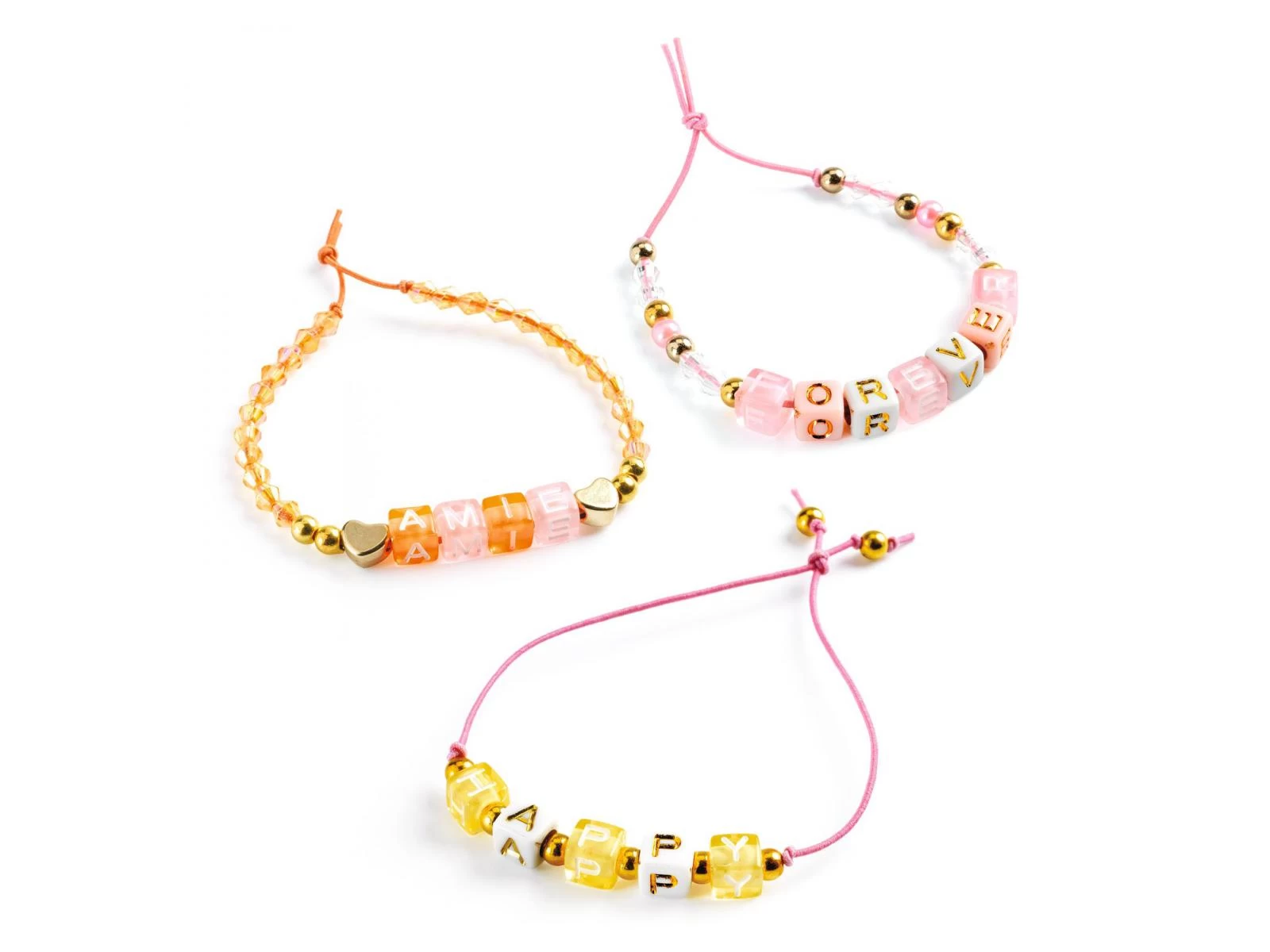 Un coffret très complet contenant 1 000 perles pour créer de jolis bracelets avec des prénoms ou des messages. Un assortiment de perles colorées et dorées, bien pensé pour un résultat toujours harmonieux. L’enfant enfile sur les fils élastiques les perles pour réaliser de jolis bracelets en toute liberté.