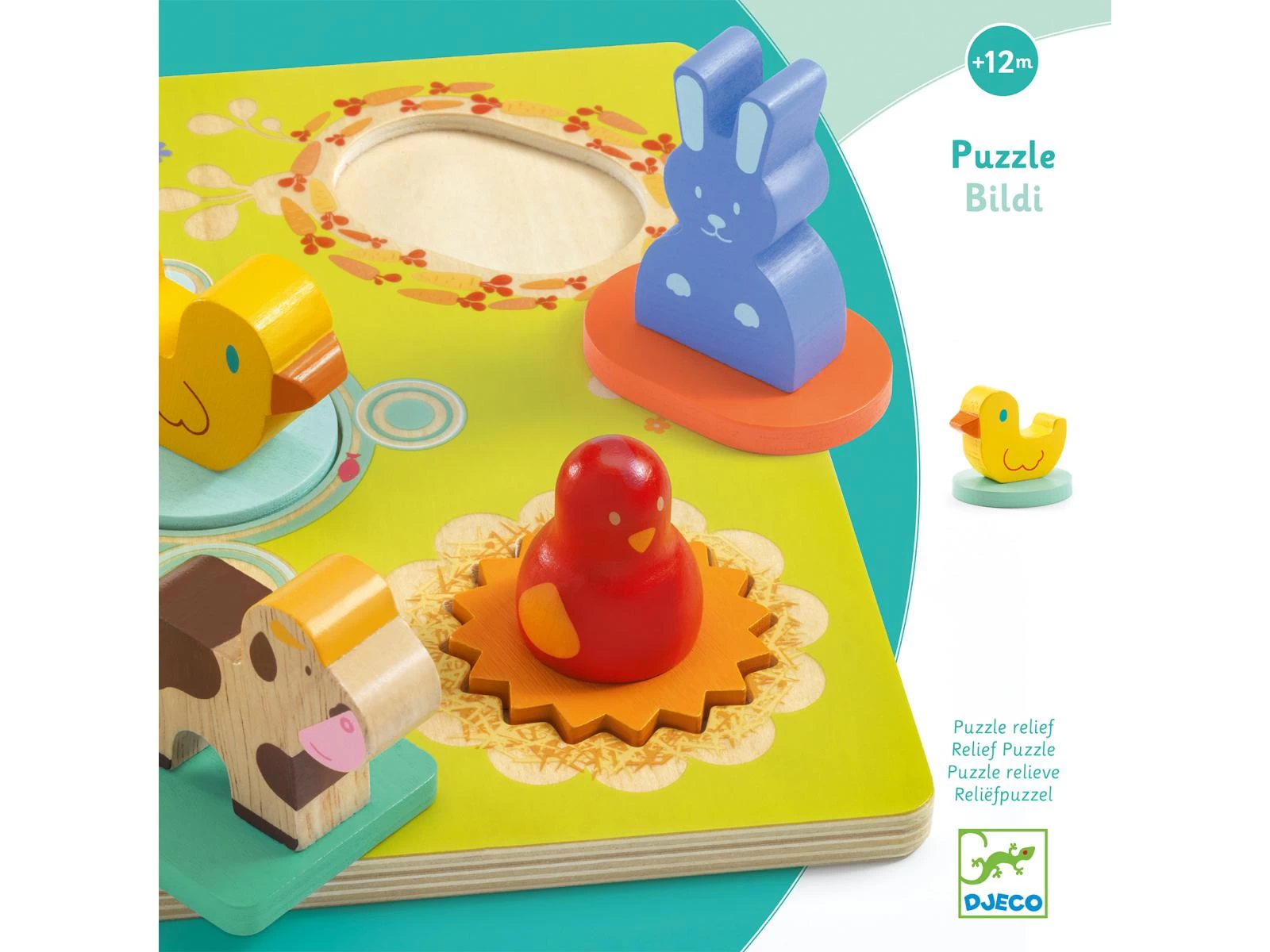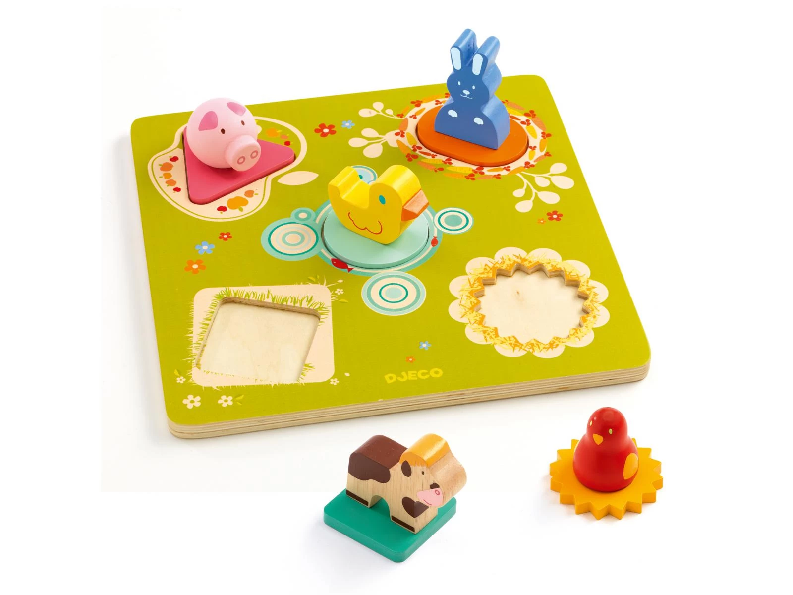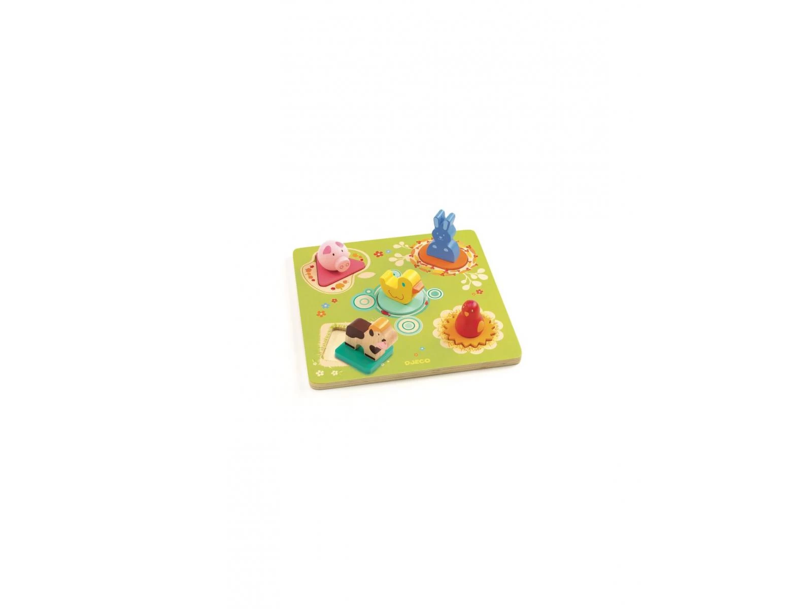 Bildi est un puzzle bois facile à manipuler sur le thème de la ferme : les pièces du puzzle surmontées de figurines d’animaux facilitent la préhension par les petites mains. L’enfant place les pièces en reconnaissant les formes géométriques sur le plateau.