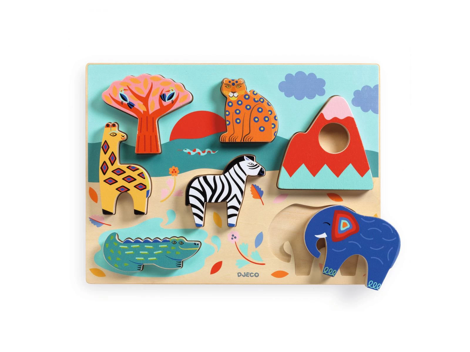 Savana Story est un puzzle en bois sur le thème de la savane. Les pièces épaisses tiennent debout et permettent à l’enfant de s’amuser avec les animaux et le décor.