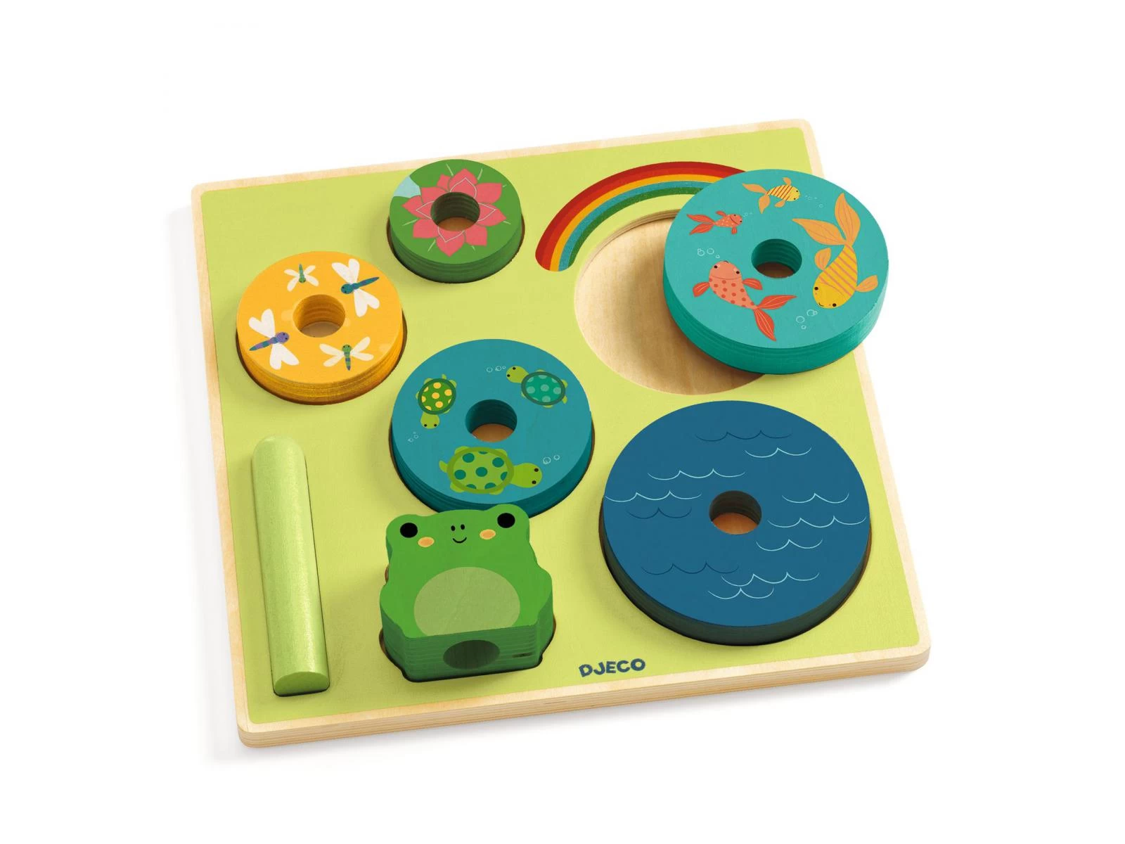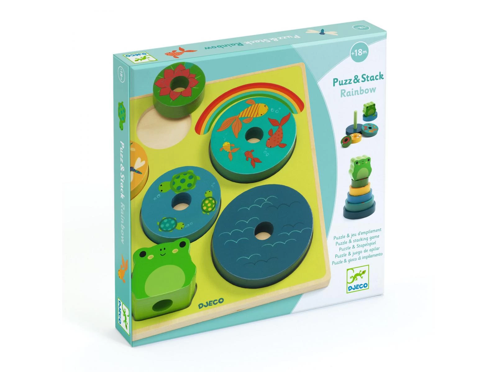 Puzz & Stack est un puzzle en bois facile à assembler et un jeu d’empilage. Les pièces s’empilent sur l’axe en bois pour former une jolie pyramide de fleurs avec une petite grenouille sur le dessus.