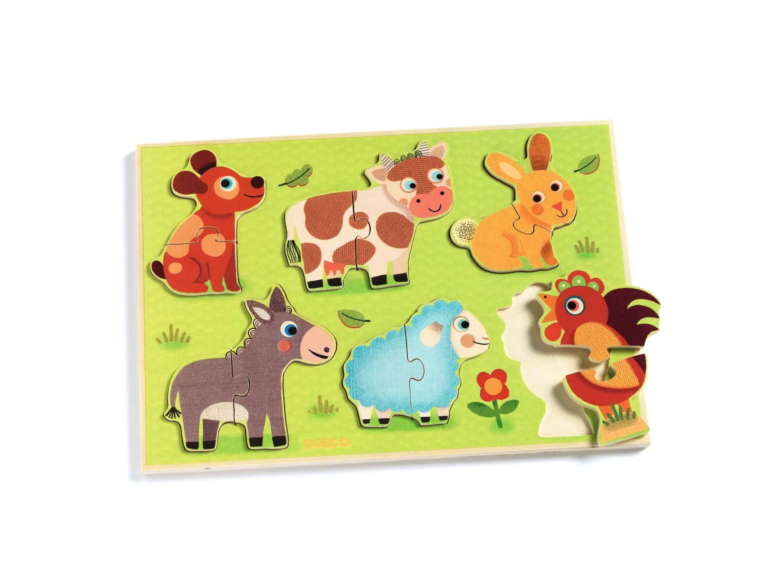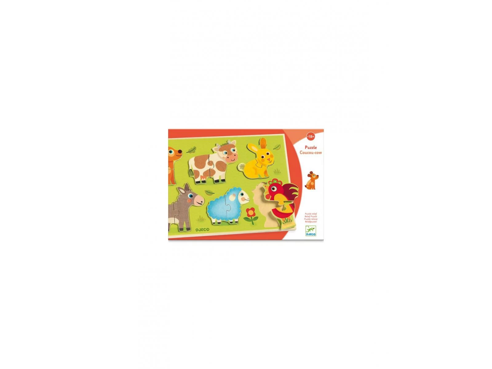 Coucou-cow est un puzzle en bois sur le thème de la ferme. L’enfant s’amuse à reconstituer les 6 animaux. Chaque animal est composé de 2 pièces aux formes simples et colorées qu’il peut ensuite replacer dans le plateau.