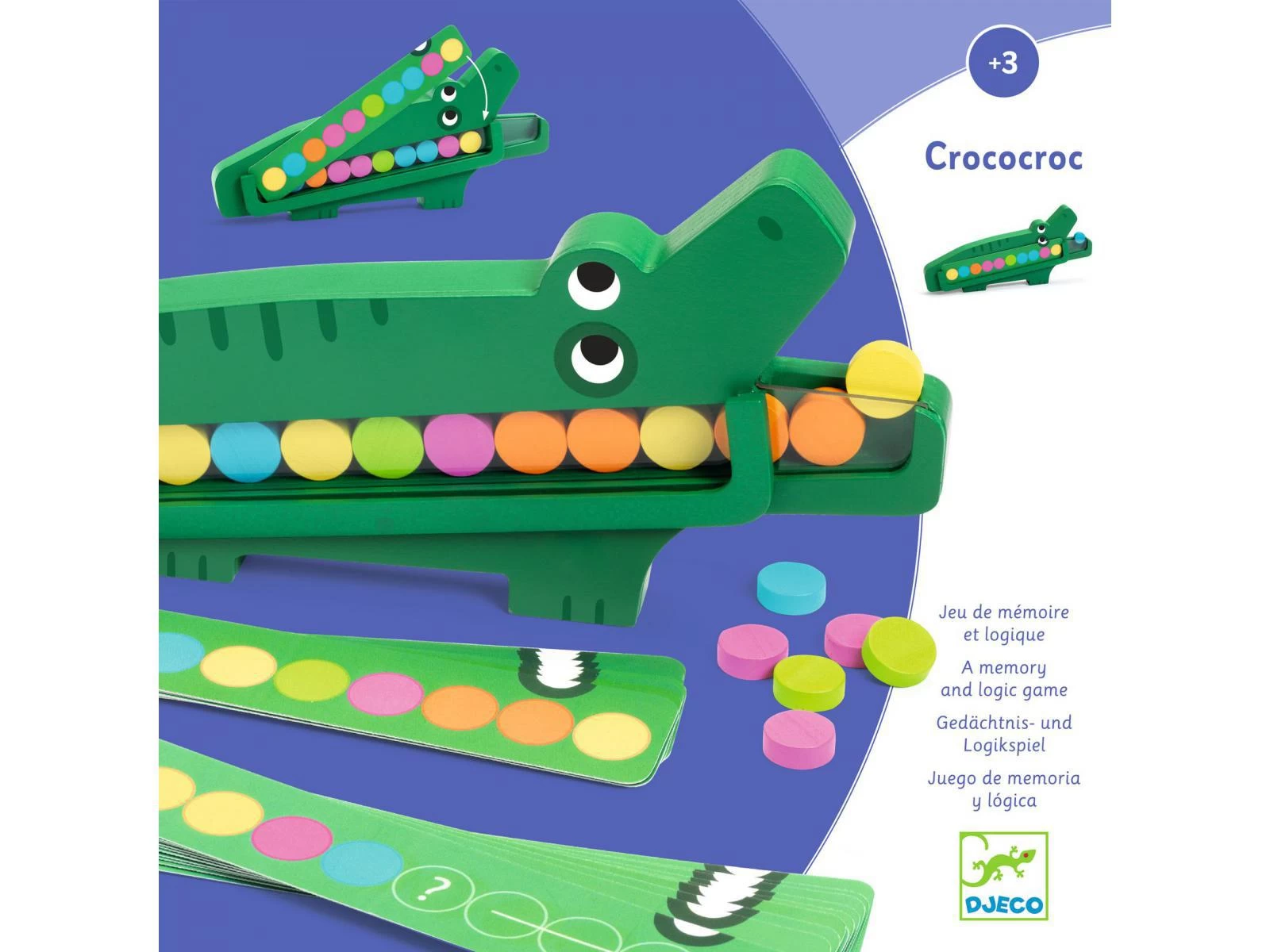 Un crocodile en bois qui va dévorer les pions colorés. L’enfant place la carte en cachant le ventre du croco. Il insère ensuite les pions colorés en suivant les instructions de la carte à l’aveugle. Un jeu dès 3 ans pour apprendre tout en s’amusant !