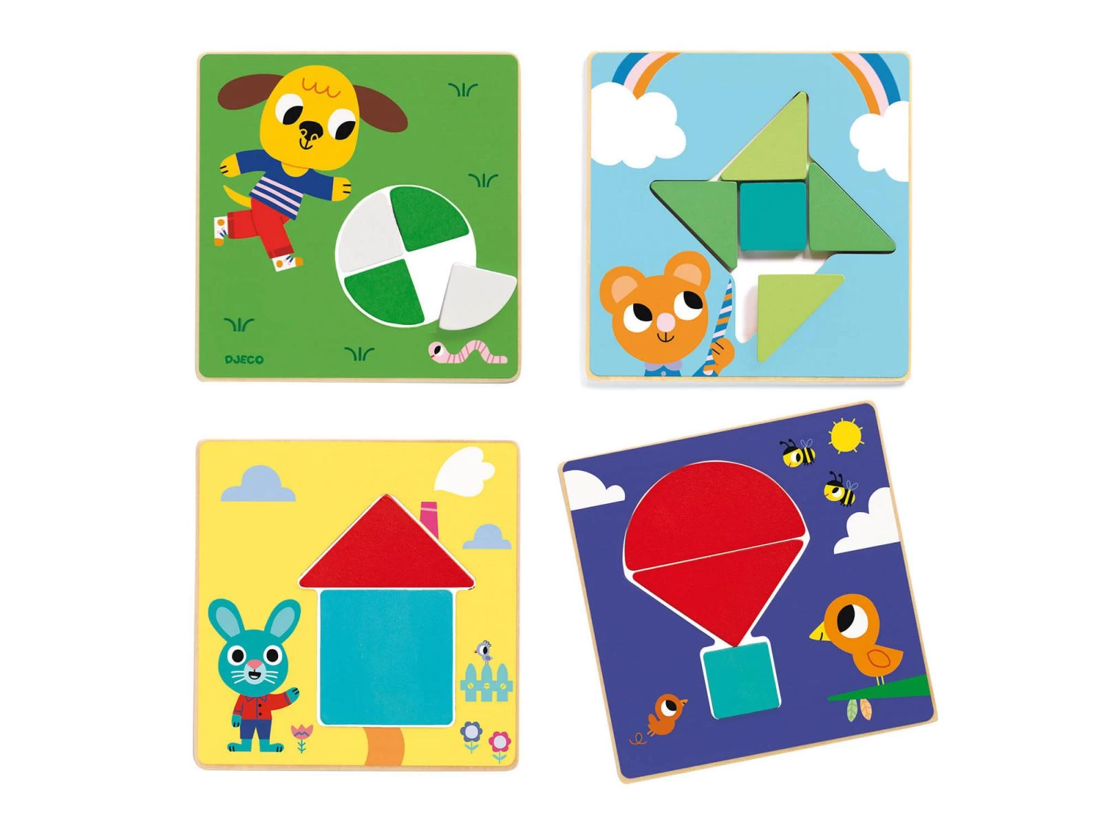 Contenu : 6 planches en bois illustrées et 12 pièces géométriques colorées en bois.