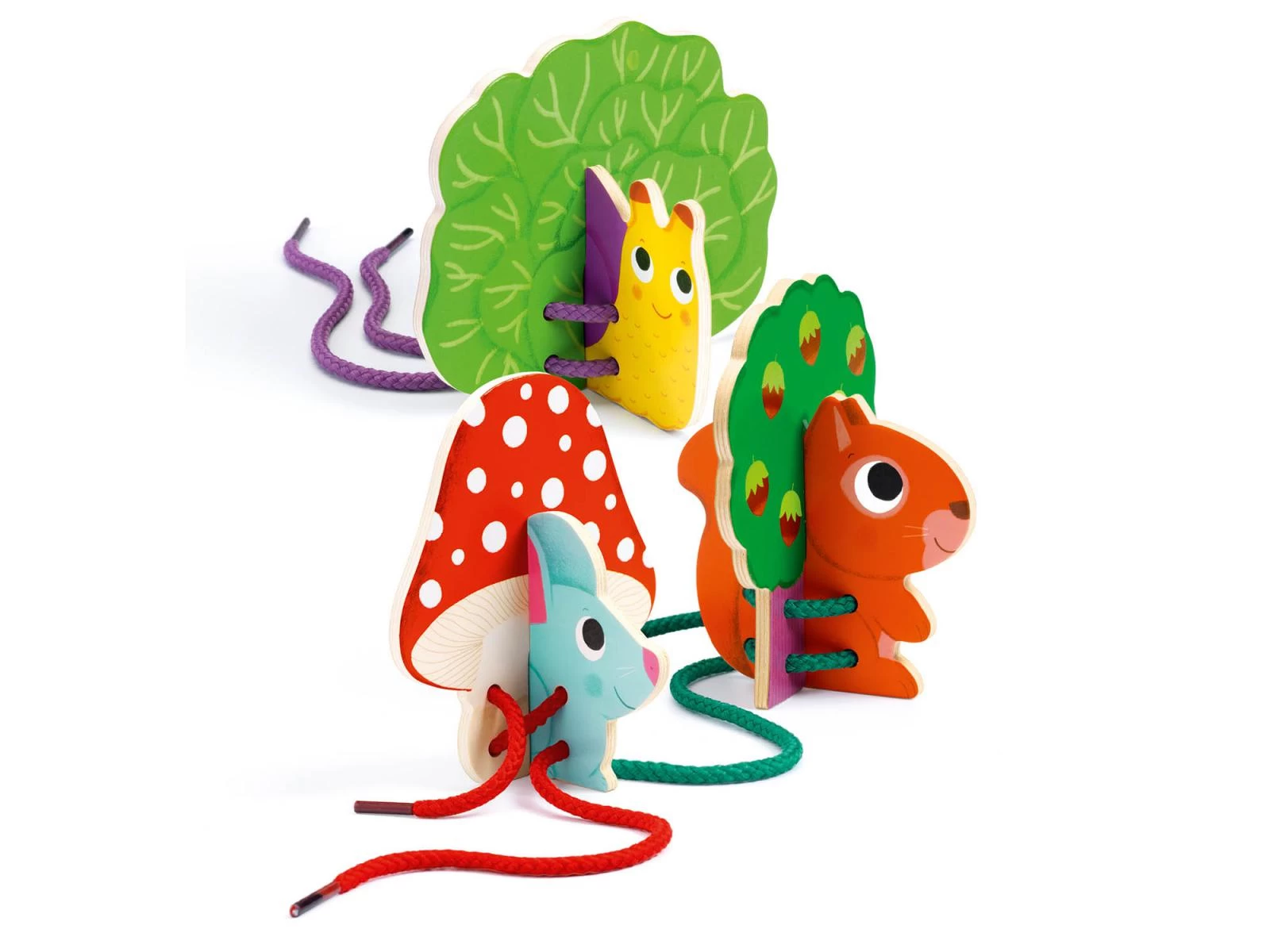 Contenu : 6 formes en bois à lacer et 3 cordons de couleurs.