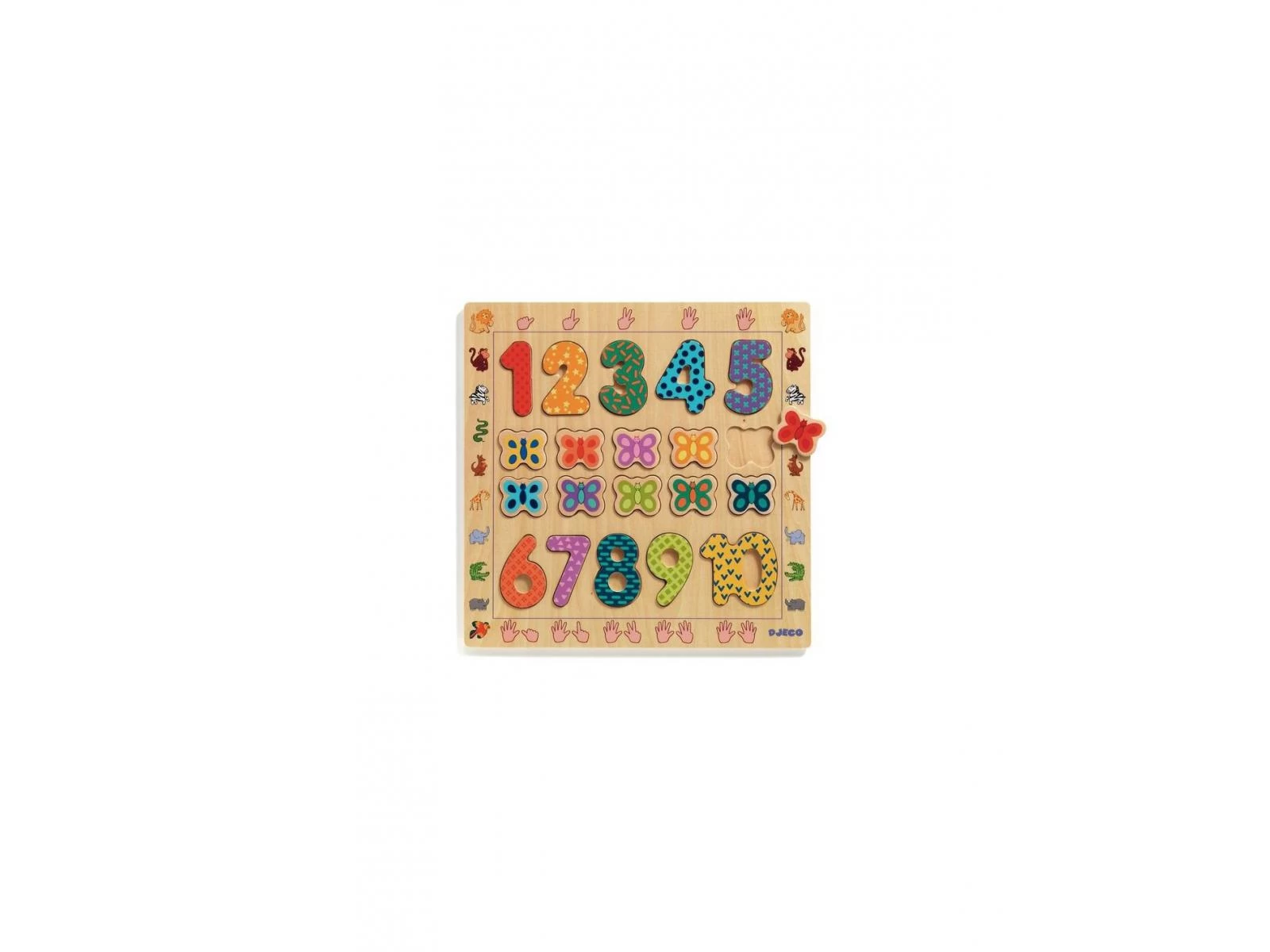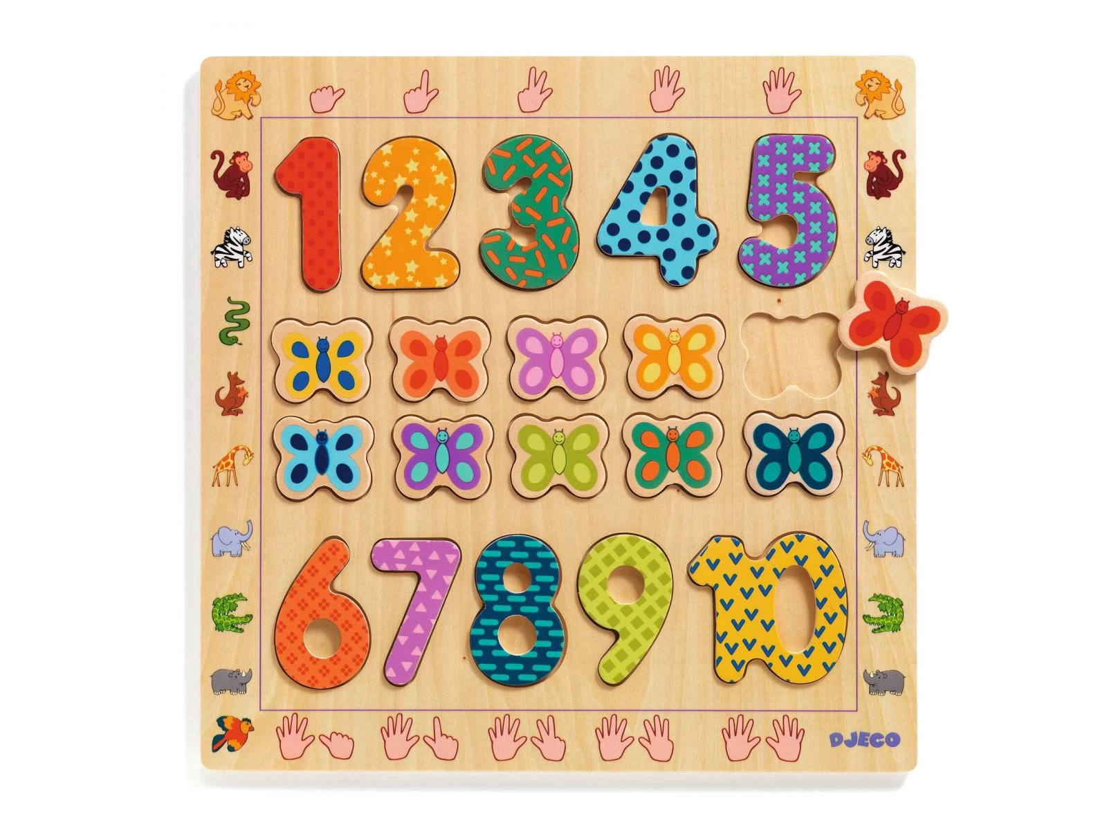 1-10 est un puzzle éducatif en bois pour découvrir les chiffres. L’enfant apprend à reconnaître les chiffres, à compter les animaux cachés sous les chiffres et à dénombrer les papillons.
