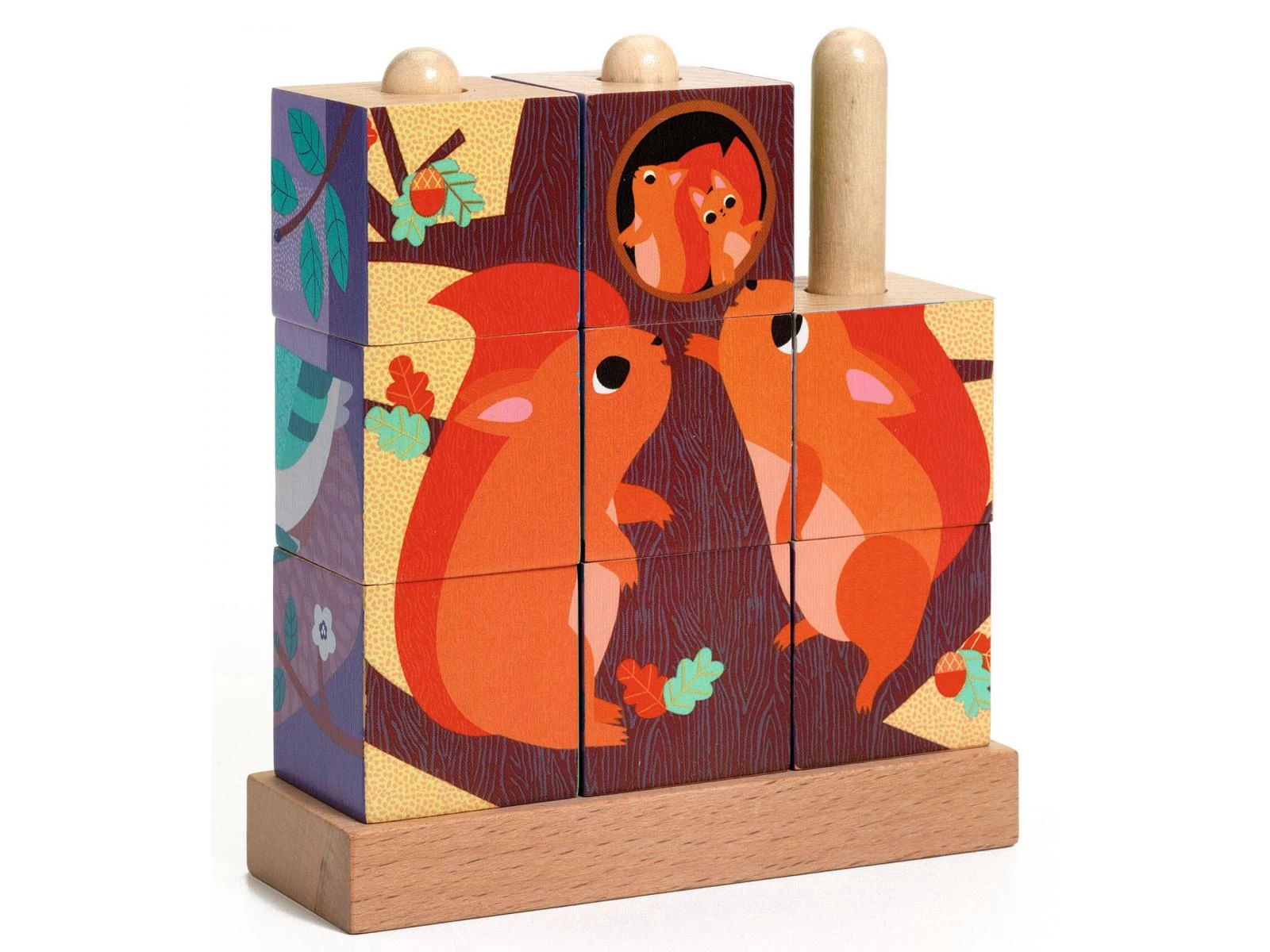 4 puzzles sur le thĂšme des animaux de la forĂȘt. Les 9 cubes en bois s’enfilent sur 3 tiges verticales pour aider l’enfant Ă les placer correctement.