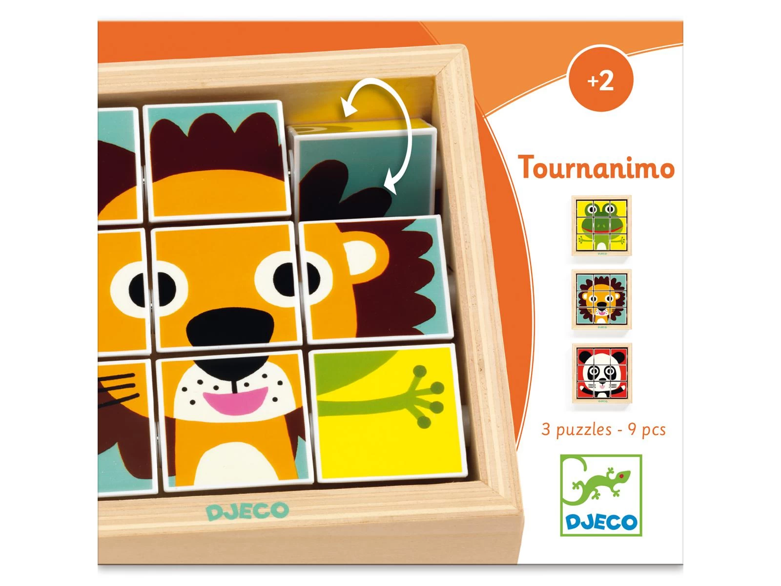 Tournanimo est un drôle de puzzle dans un cadre en bois ! Le jeu bien à plat, l’enfant fait tourner les formes pivotantes pour recréer l’un des 3 animaux : le lion, la grenouille, le panda.