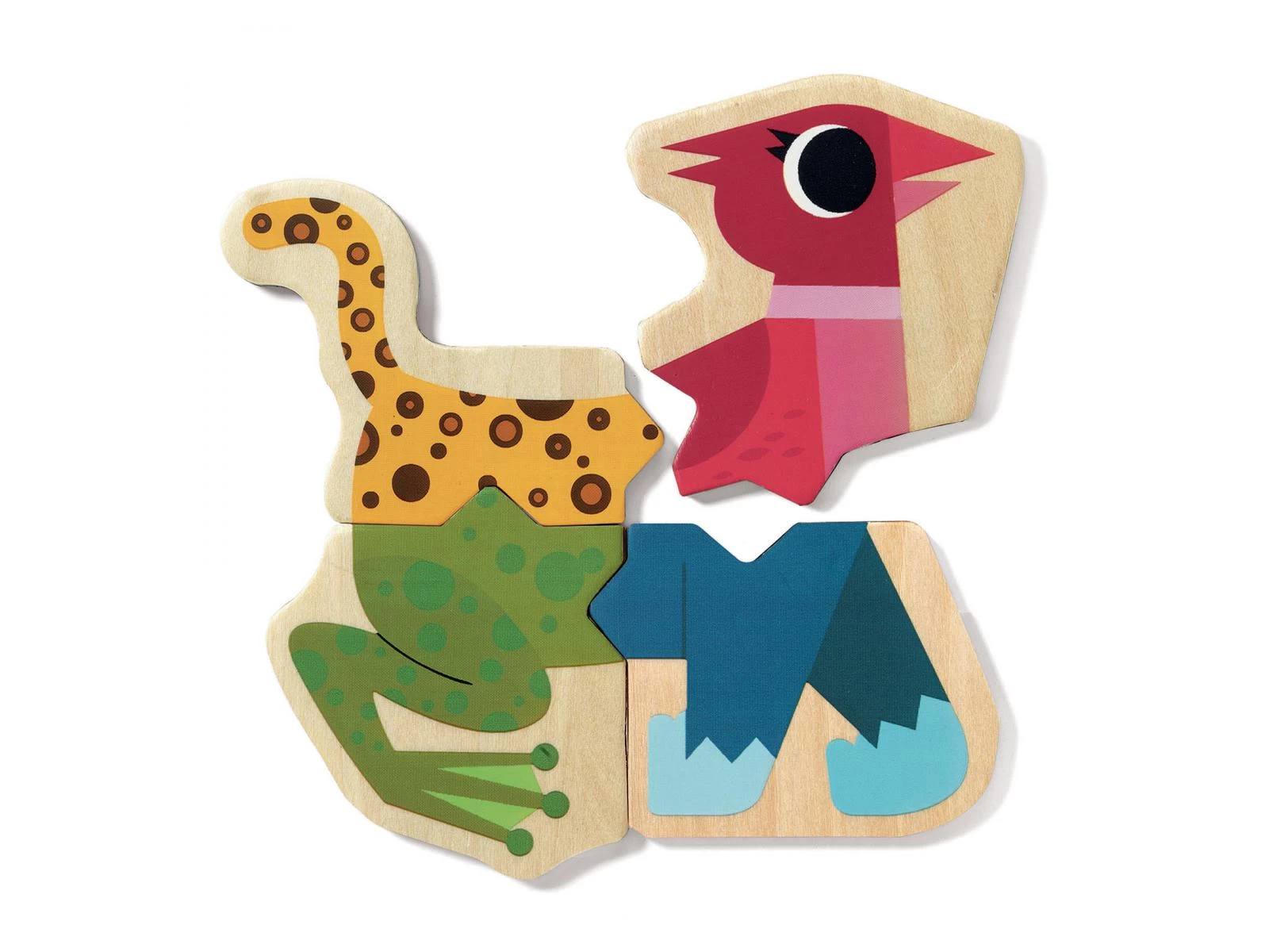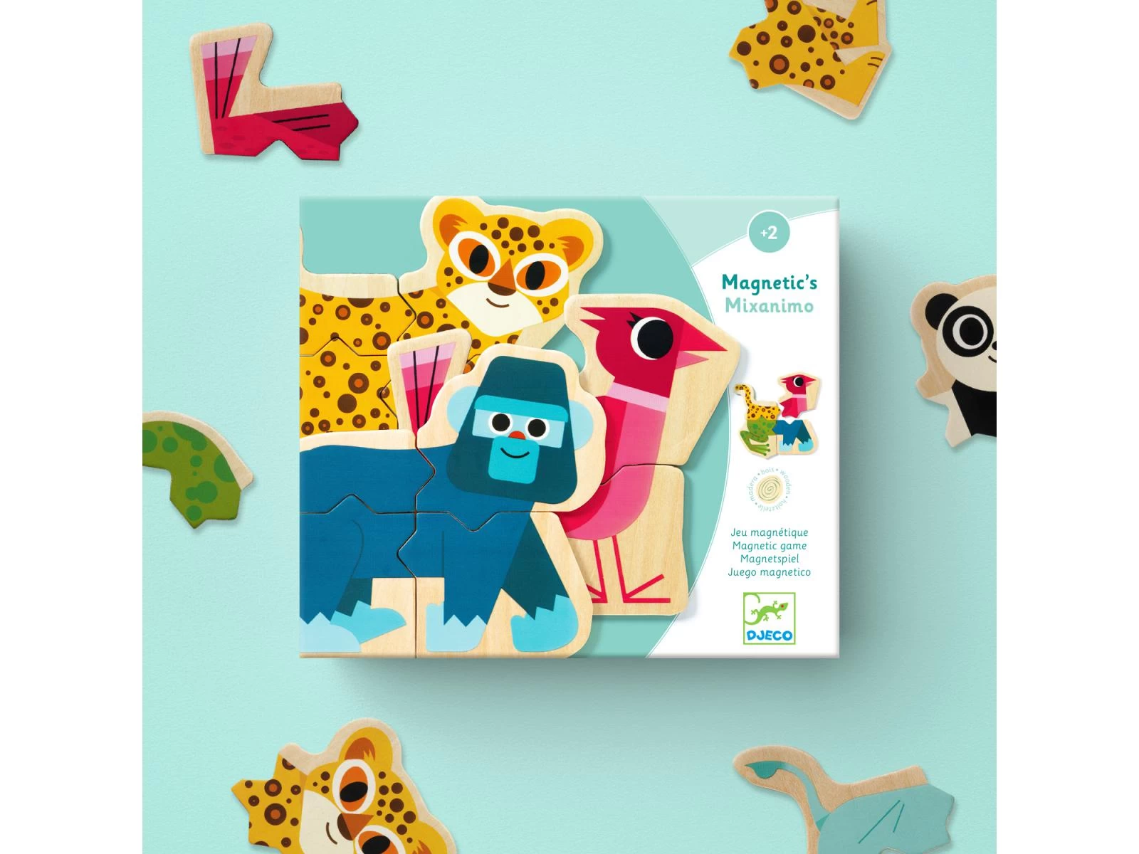 Un coffret de 24 pièces magnétiques en bois pour reconstituer des animaux ou en imaginer d’autres plus farfelus. L’enfant aide le gorille à retrouver son corps et ses pattes !