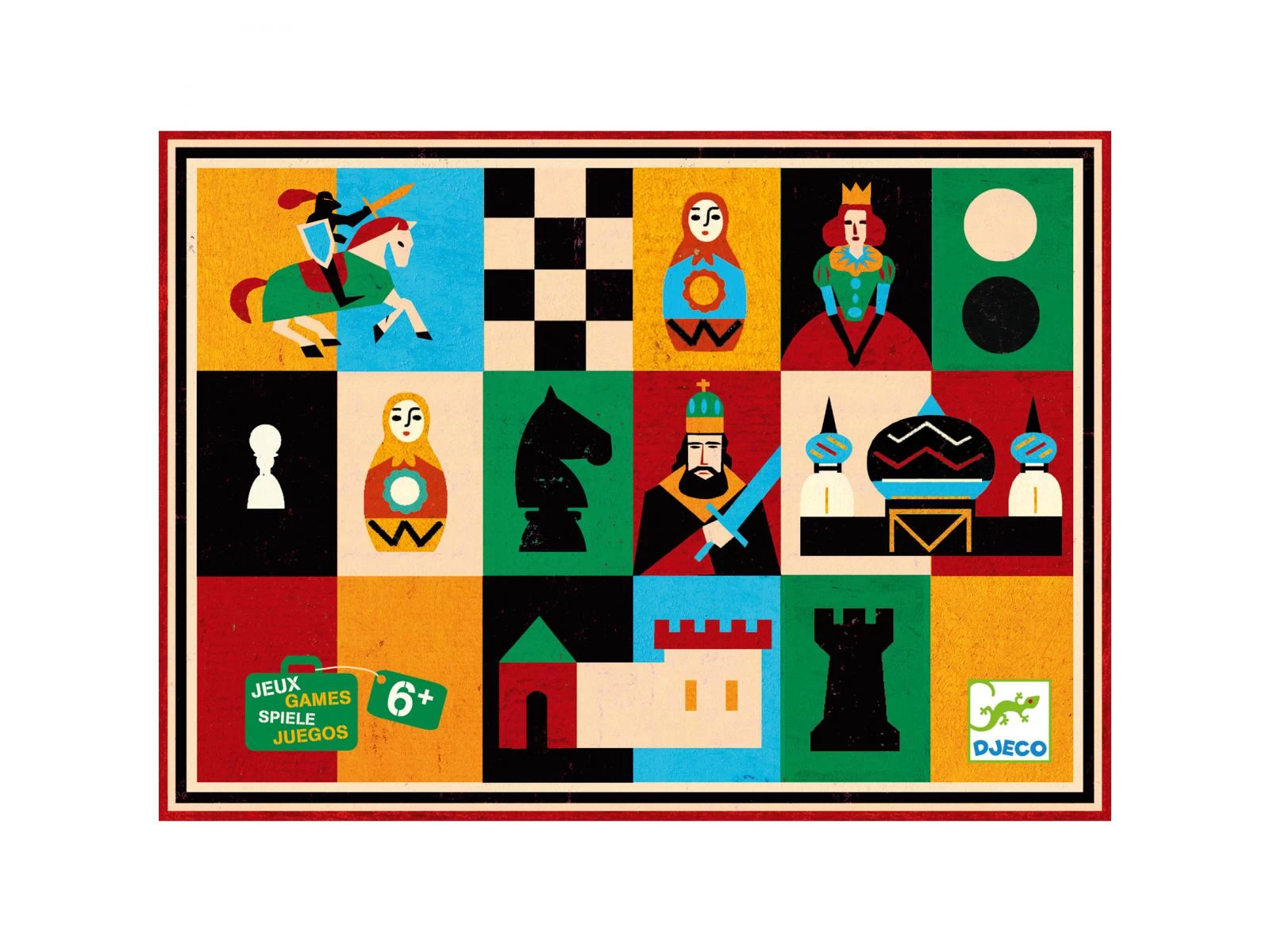 Une mallette contenant un jeu d’échecs et un jeu de dames avec des pièces en bois et un livret d’initiation.