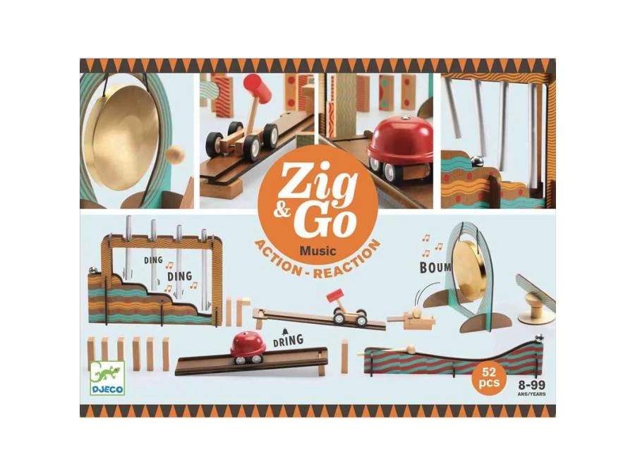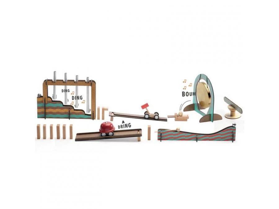 Un grand set de jeu de réaction en chaîne, de réflexion et de construction en bois sur le thème de la musique et des sons. Gong et dring ! L’enfant suit les 3 modèles du livret pour construire son parcours ou en imagine d’autres à l’infini. Ce jeu à partir de 8 ans est compatible avec tous les coffrets de la collection pour inventer des parcours action-réaction encore plus ingénieux!