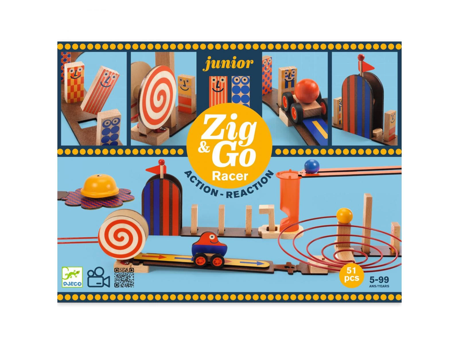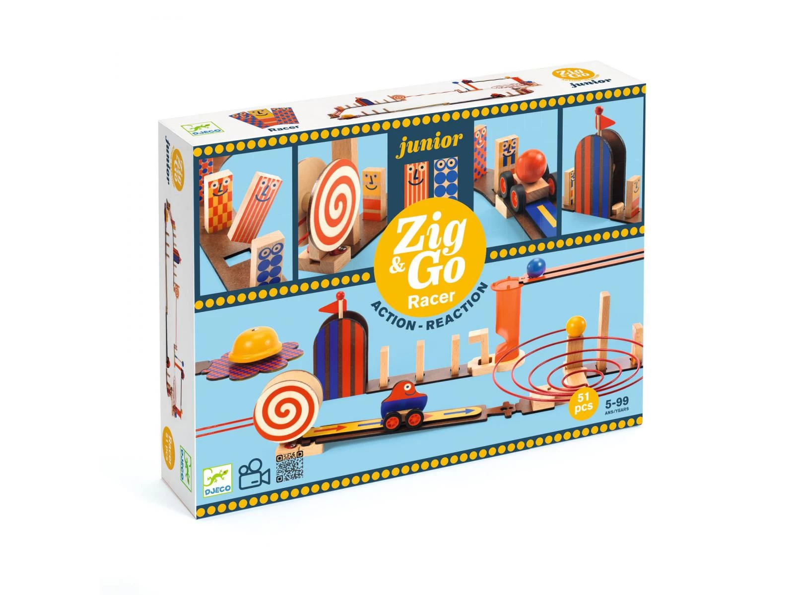 Racer est un jeu de réaction en chaîne, de réflexion et de construction en bois pour les enfants à partir de 5 ans. L’enfant suit les 3 modèles du livret pour construire son parcours ou en imagine d’autres à l’infini. Un contenu époustouflant avec de drôles de dominos Zig qui représentent des bonhommes. Ce jeu est compatible avec tous les coffrets de la collection pour inventer des parcours action-réaction encore plus ingénieux !
