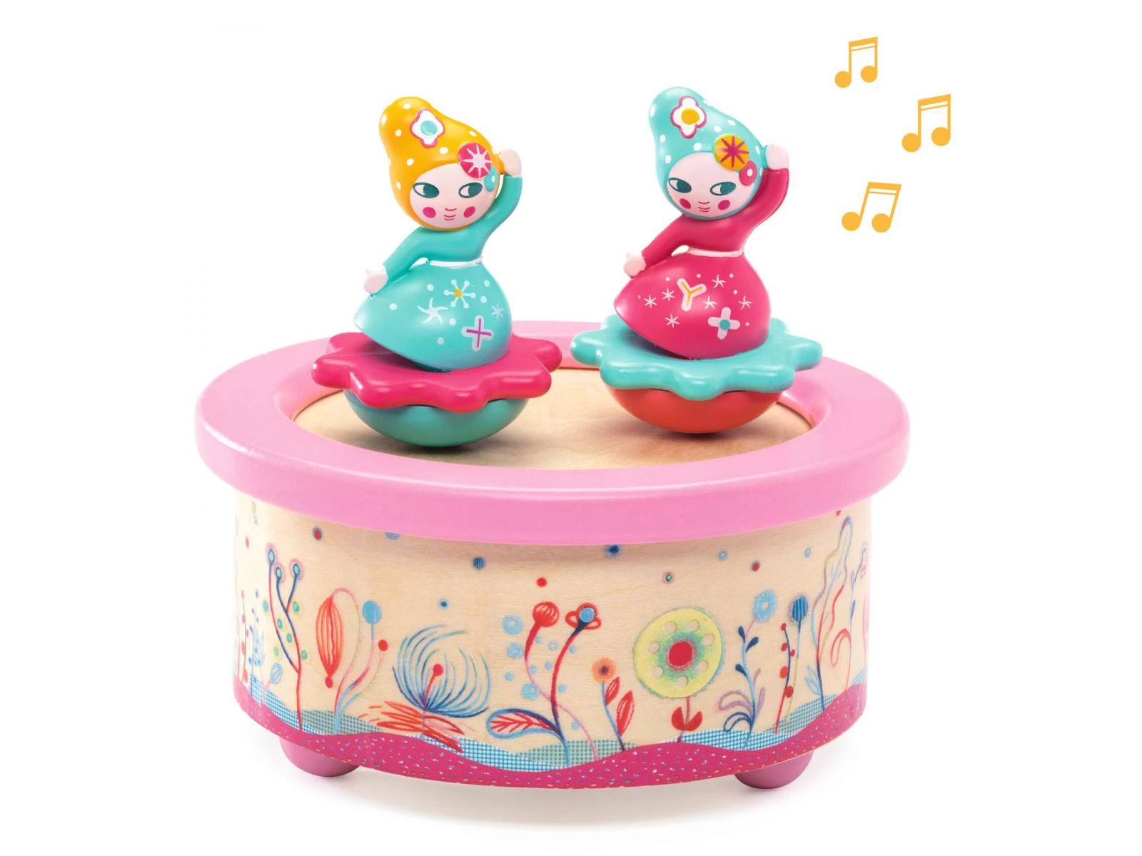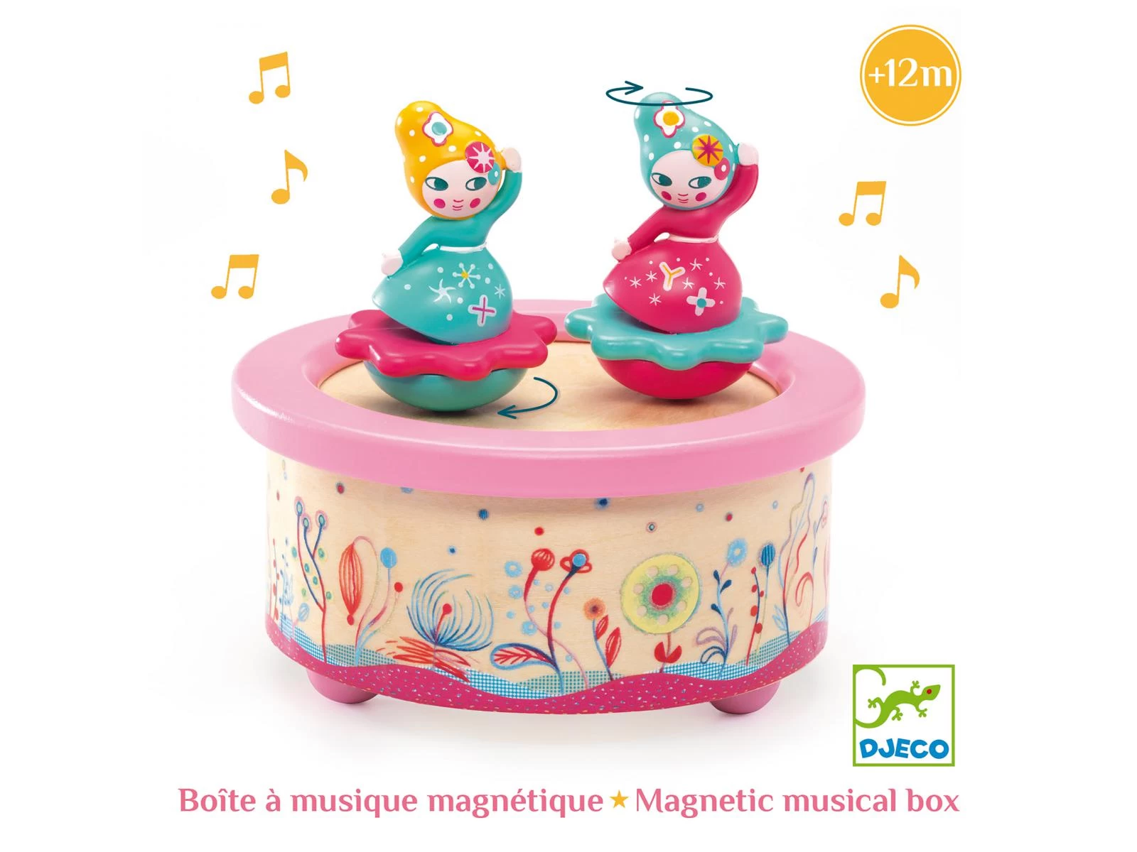 Flower Melody est une boîte à musique magnétique ronde joliment illustrée avec deux jolies danseuses. Il suffit de remonter la clé et les figurines se mettent à tourner et à danser au son de la musique « La valse des fleurs » de Piotr Ilitch Tchaïkovski.