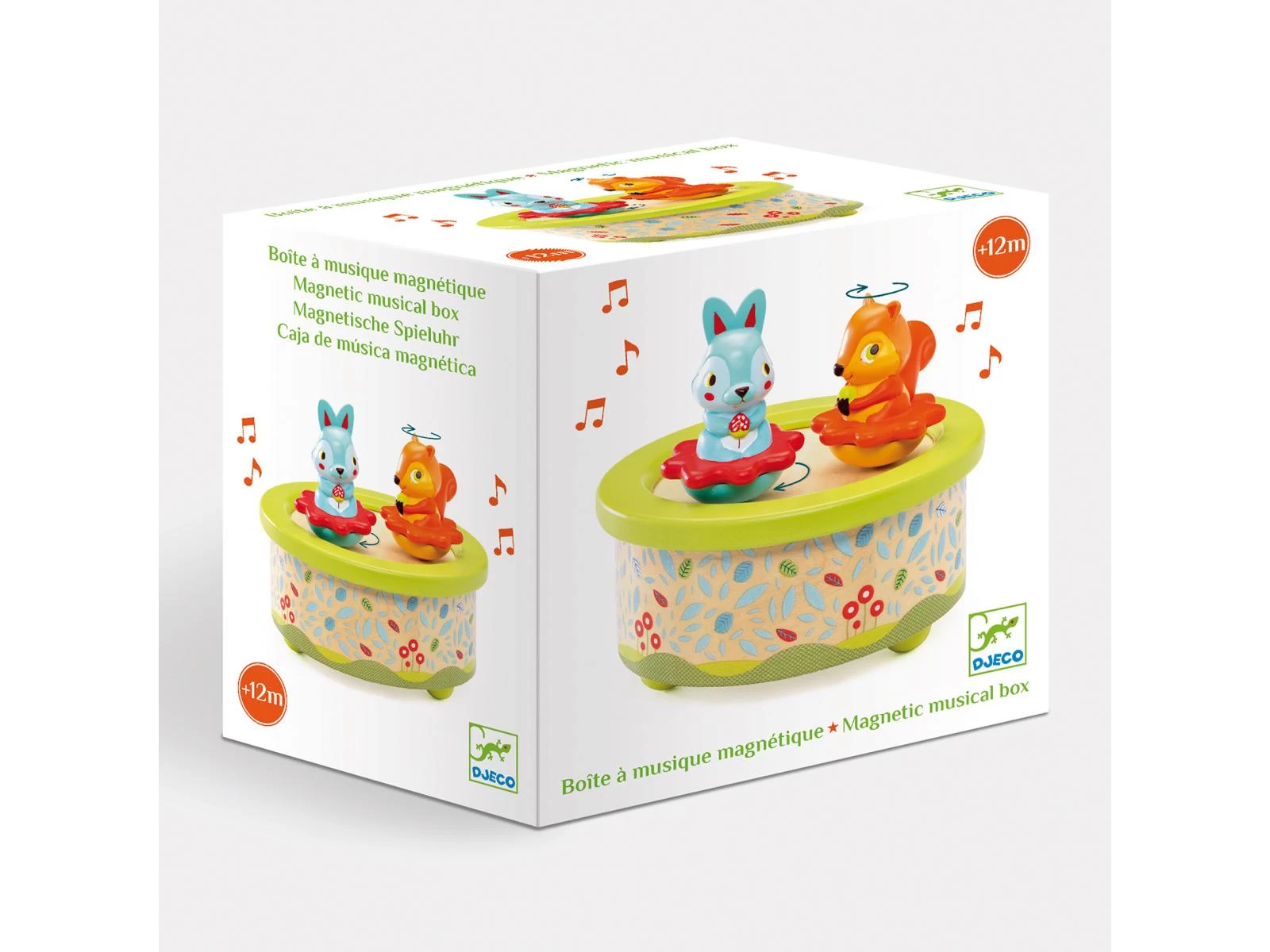 Friends Melody est une boîte à musique magnétique ronde joliment illustrée avec un lapin et un écureuil. Il suffit de remonter la clé et les figurines se mettent à tourner et à danser au son de la musique « Berceuse » de Franz Schubert.