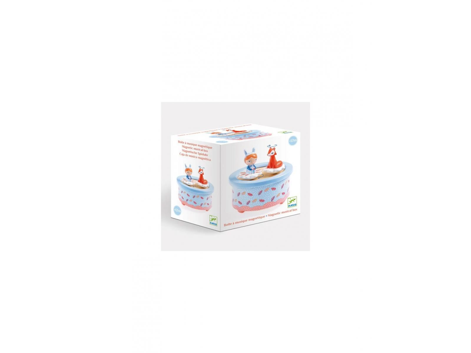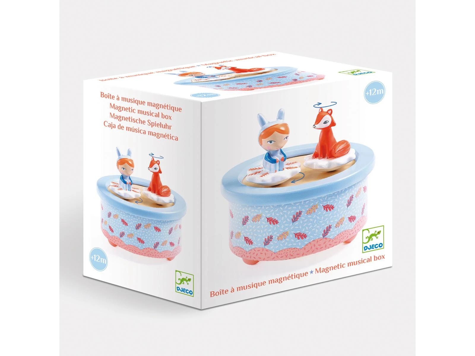 Fox Melody est une boîte à musique magnétique ronde joliment illustrée avec un petit garçon et son renard. Il suffit de remonter la clé et les figurines se mettent à tourner et à danser au son de la musique « Berceuse » de Franz Schubert.
