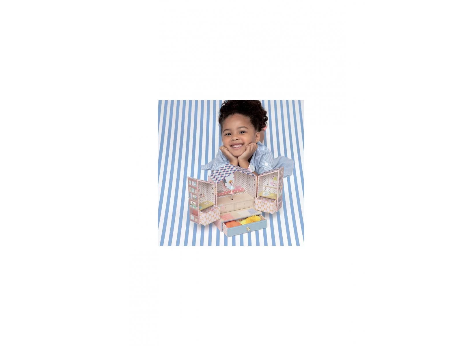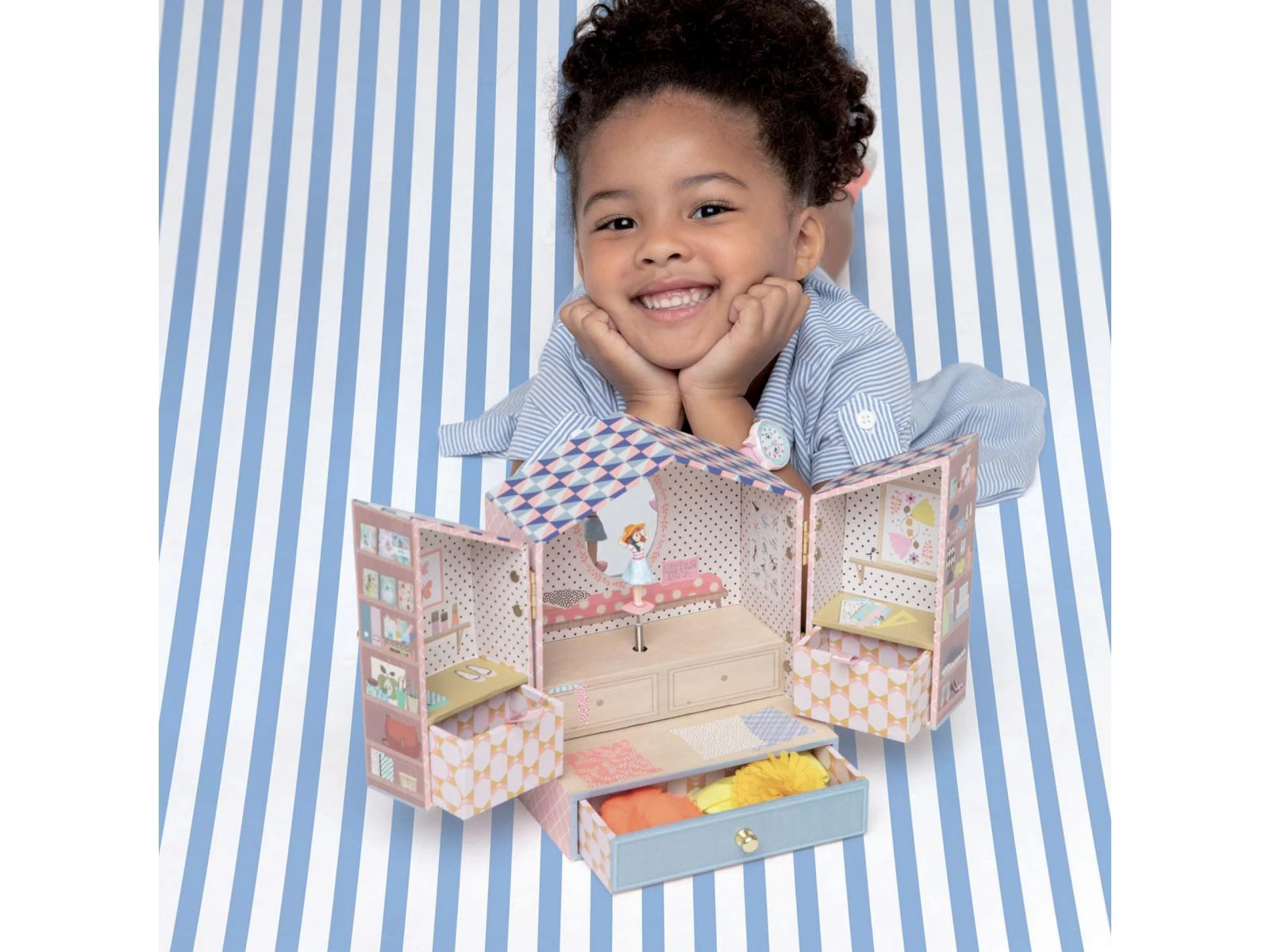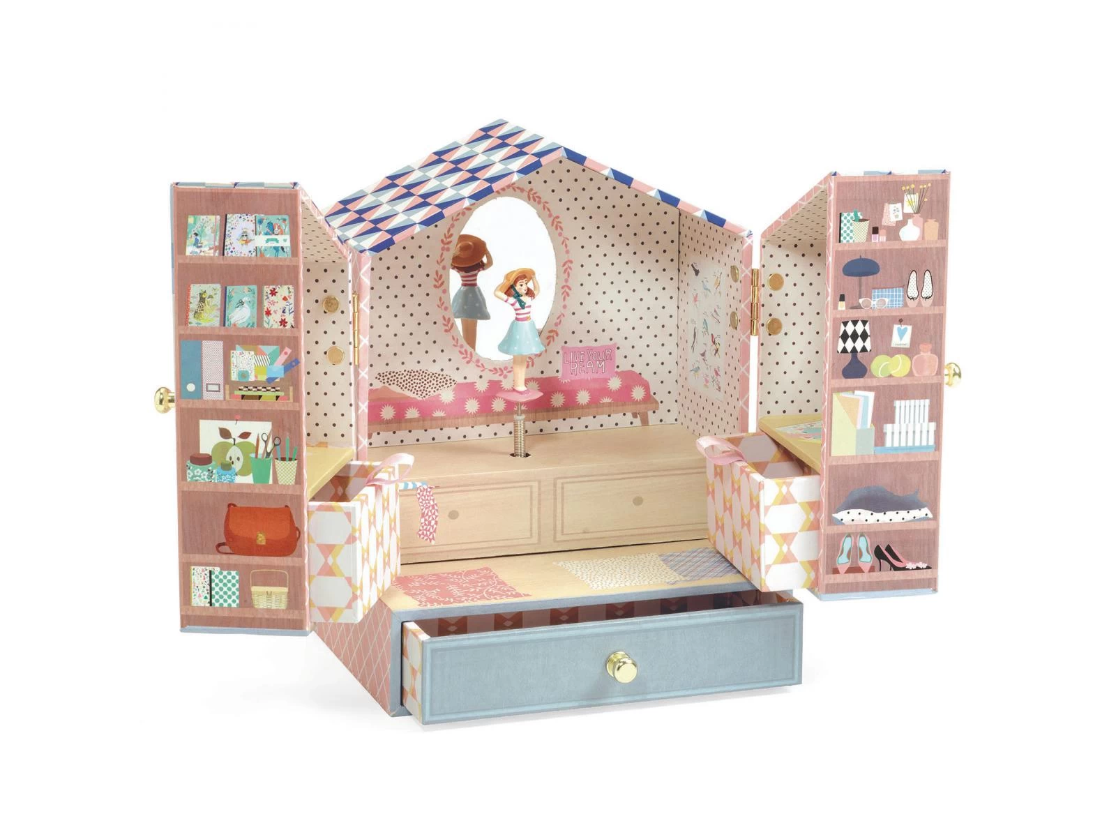 Tinou Shop est une boîte à musique joliment illustrée avec trois tiroirs pour ranger ses bijoux et secrets. Tournez la manivelle, ouvrez les portes de ce joli magasin, et surprise ! Une fillette finement sculptée tourne et se reflète sur un miroir silhouetté au son de la musique « La flûte enchantée » de Wolfgang Amadeus Mozart.