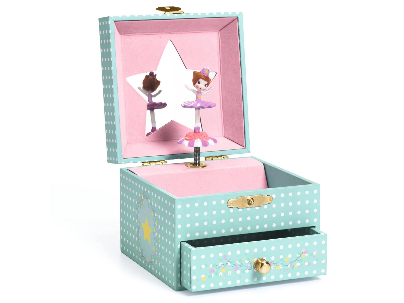 Délicate Ballerine est une boîte à musique joliment illustrée avec un tiroir pour ranger ses bijoux et secrets. Tournez la manivelle, ouvrez la boîte, et surprise ! Une ballerine finement sculptée tourne et se reflète sur un miroir silhouetté au son de la musique « Invitation à la valse » de Carl Maria von Weber.