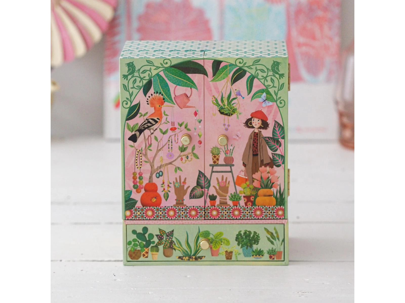 Jardin secret est une boîte à musique joliment illustrée avec un grand et un petit tiroir pour ranger ses bijoux et secrets, deux portes bagues, et quatre crochets dorés pour suspendre colliers et bracelets. Tournez la manivelle, ouvrez les portes de ce joli coffret et surprise ! Une jeune fille finement sculptée tourne et se reflète sur un miroir en forme de fleur au son de la musique Invitation à la valse de Carl Maria Von Weber.