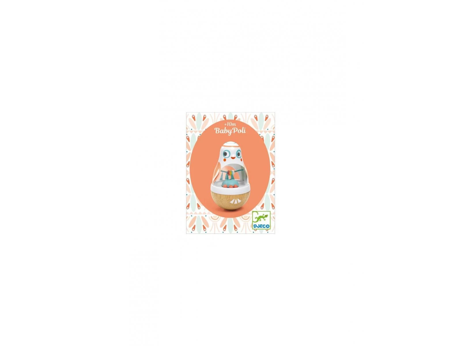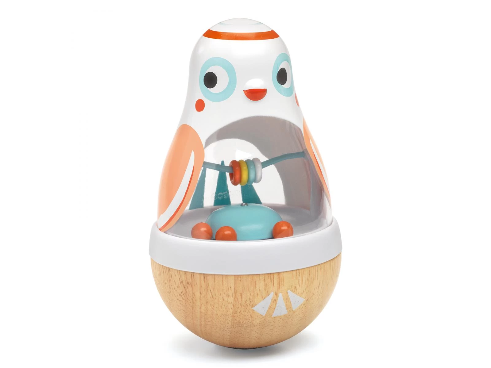 Un culbuto chouette en bois naturel et aux couleurs pastel, destiné aux petits dès 10 mois. Quand il se balance, on observe par transparence les billes et les anneaux qui bougent. Renversé, le jouet revient toujours à la verticale.