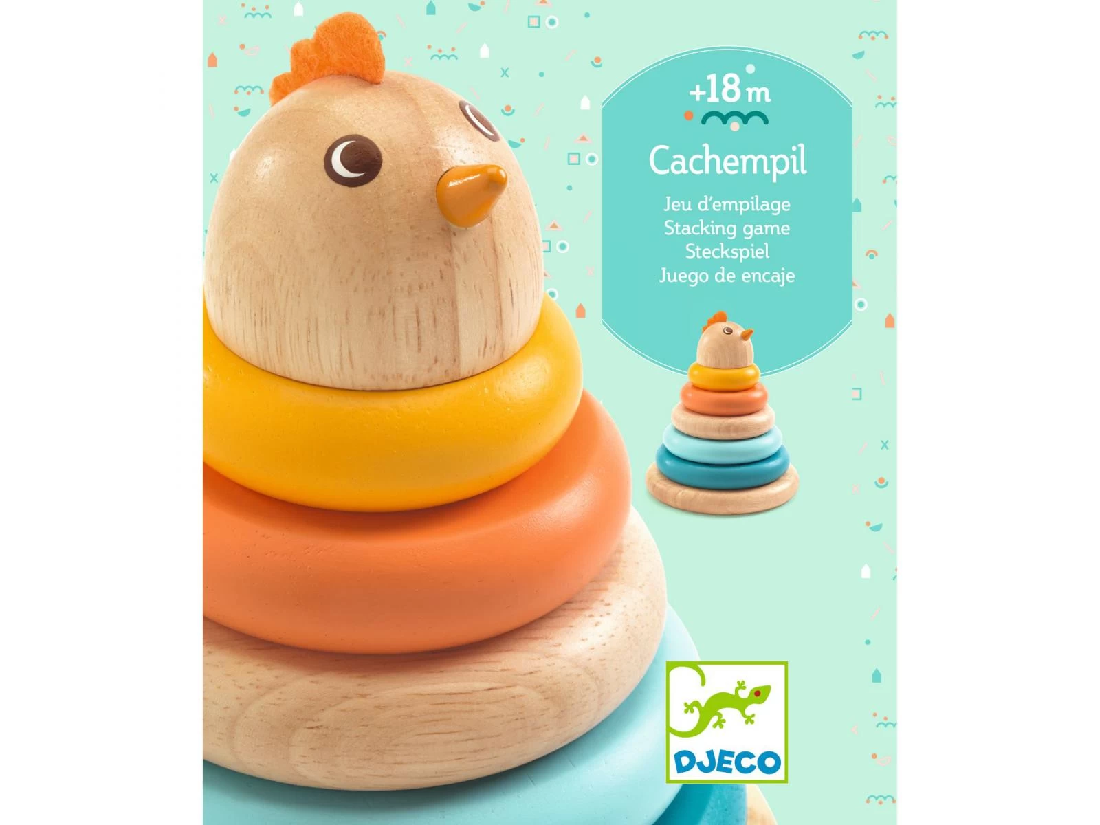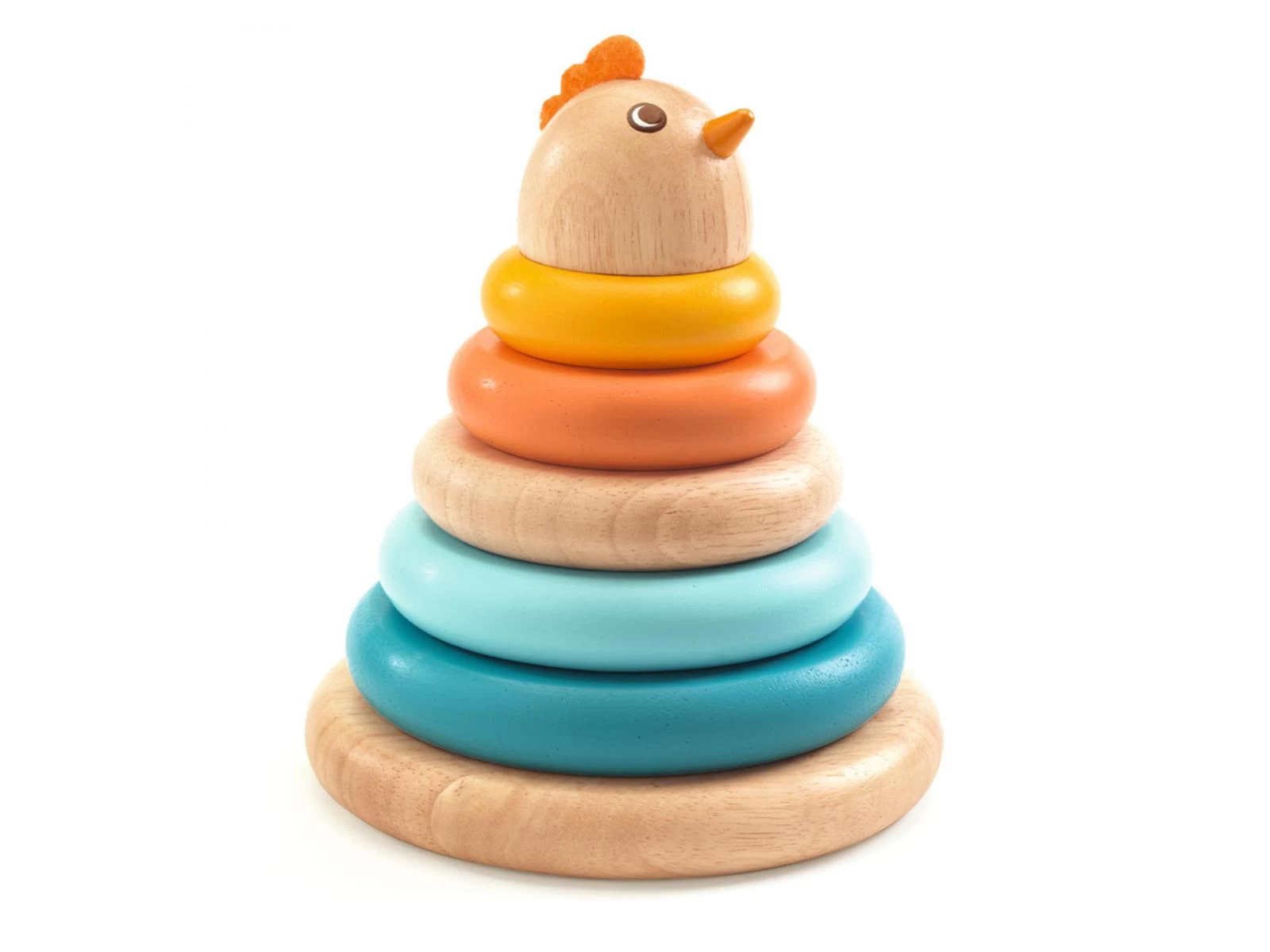 Un jeu d’empilage en bois pour reproduire une poule avec les 5 anneaux. L’enfant empile dans l’ordre les disques du plus grand au plus petit et ajoute la tête de la poule pour terminer son animal. Une surprise à découvrir sous le plus grand des anneaux.
