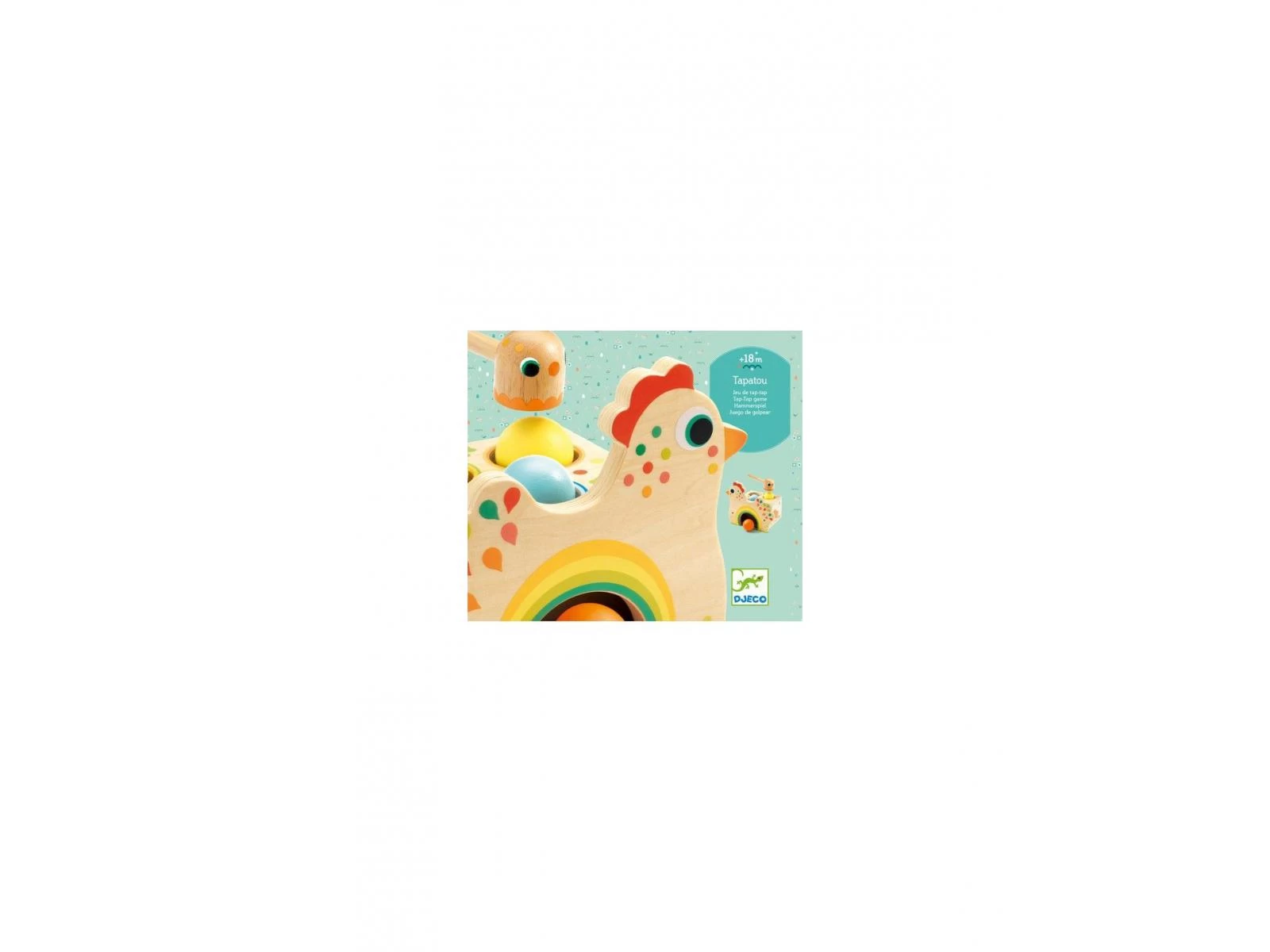 Un jeu de tap-tap en bois naturel et aux couleurs vives. Une jolie boîte en forme de poule sur laquelle l’enfant place les 3 boules colorées sur les trous et tape à l’aide du marteau pour les faire tomber.