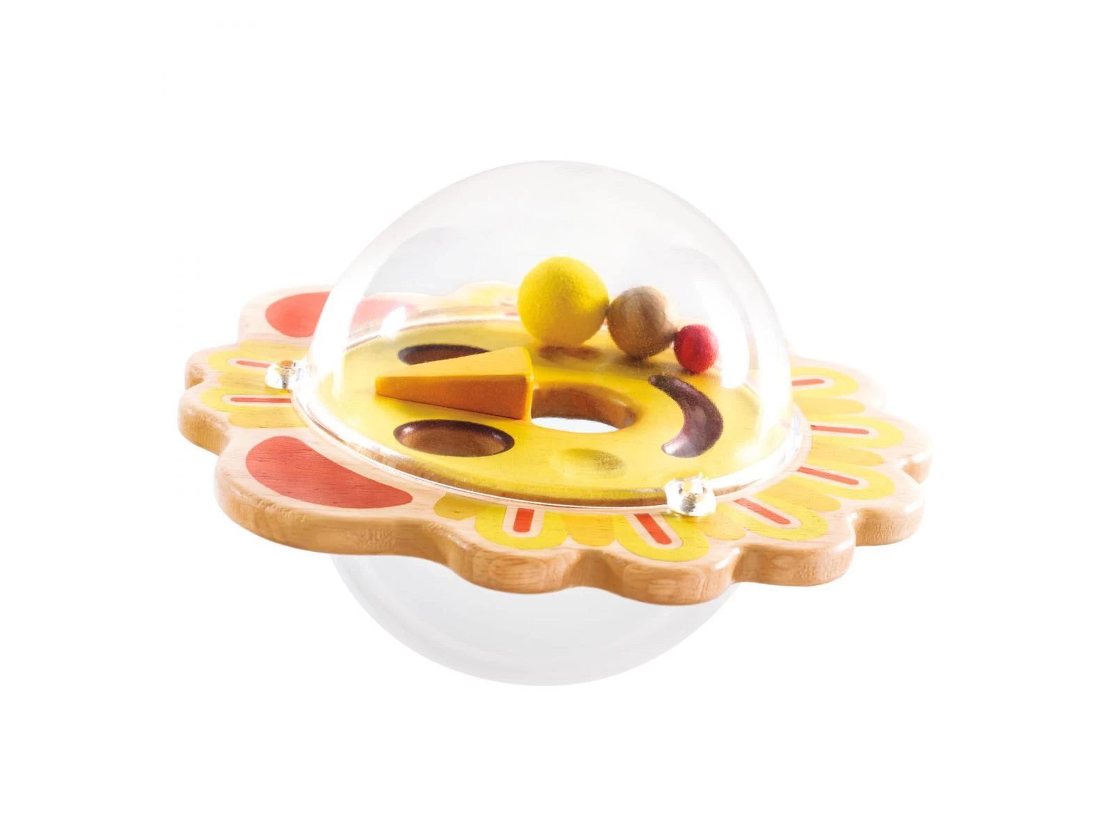 Piti Wizi est un jeu de manipulation pour les petits. Appuyé sur une table, l’enfant fait basculer la balle pour diriger facilement les billes autour des murets et vers le trou afin de les faire disparaître, puis recommence de l’autre côté avec une image différente.