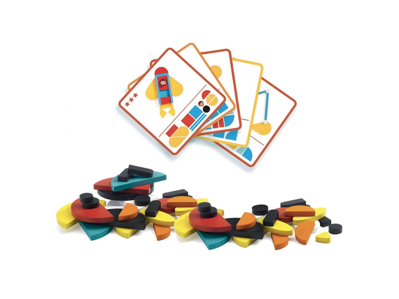 Un jeu de construction en bois pour créer des véhicules colorés. L’enfant utilise les pièces en bois en les plaçant côte à côte ou en les superposant pour reproduire les véhicules des cartes modèle.