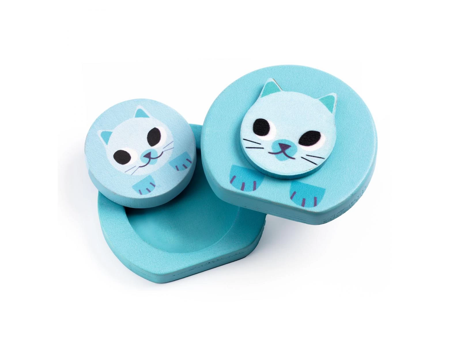Jeu de cache-cache magnétique. Cinq animaux de la ferme qui s’ouvrent en laissant apparaître un bébé de la forme géométrique du parent.