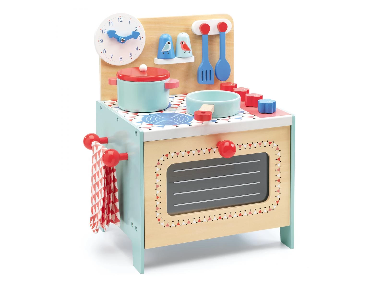 La cuisinière bleue est une cuisinière compacte en bois pour cuisinier comme un grand. Équipée d’un four et de trois plaques de cuisson : l’enfant peut cuisiner comme un chef en s’aidant des deux ustensiles et préparer de bons petits plats. L’horloge intégrée permet de surveiller le temps de cuisson. Ne pas oublier d’assaisonner son plat avant de le servir, une salière et une poivrière sont posées sur une petite étagère. Un jeu d’imitation complet et coloré.