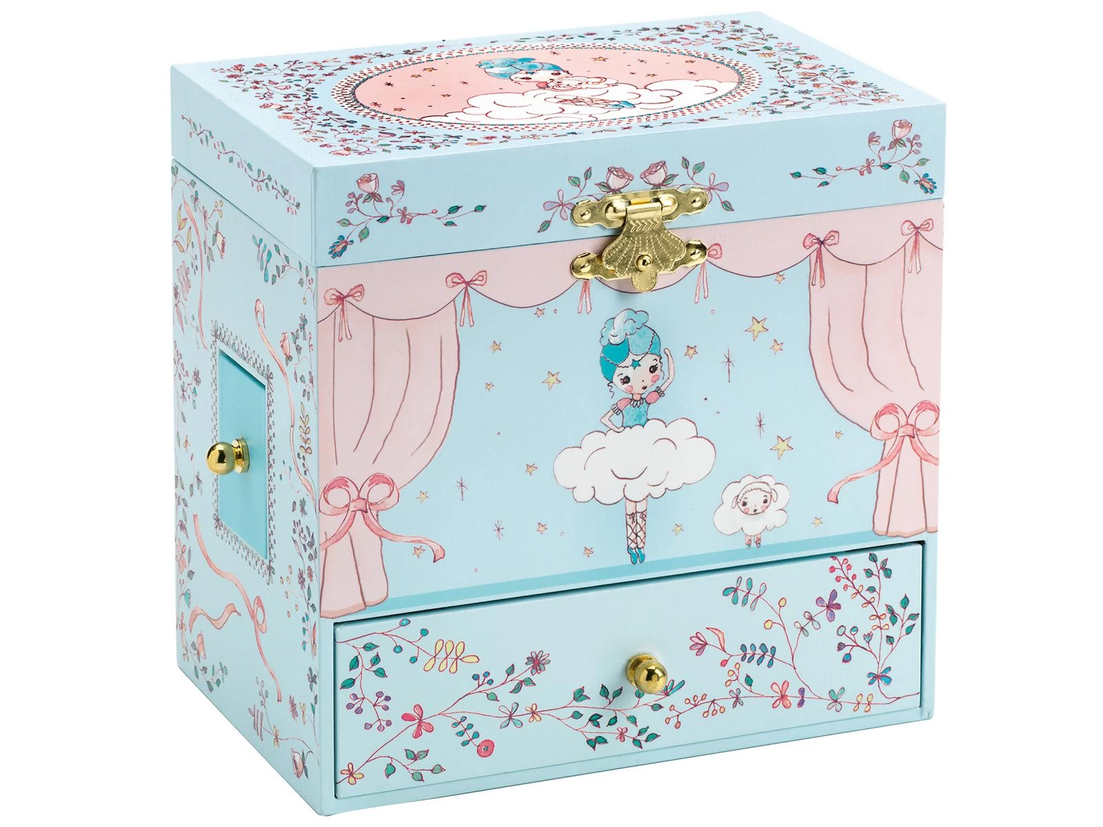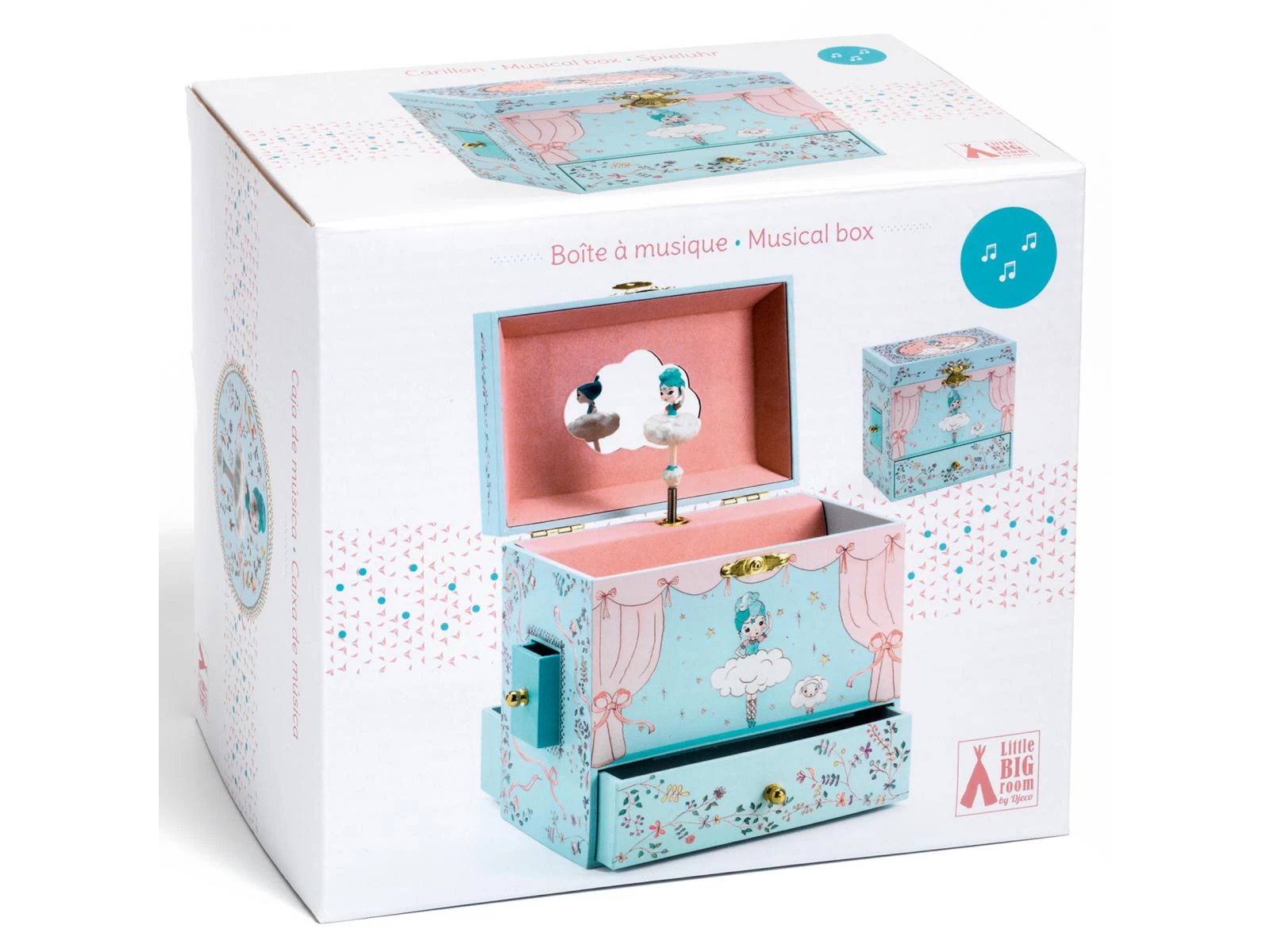 Ballerine en scène est une boîte à musique joliment illustrée avec quatre tiroirs pour ranger ses bijoux et secrets. Tournez la clé, ouvrez la boîte et tout s’anime ! Une jolie figurine finement sculptée tourne et se reflète sur un miroir silhouetté au son de la musique « Romance de l’amour » deJohann Strauss.