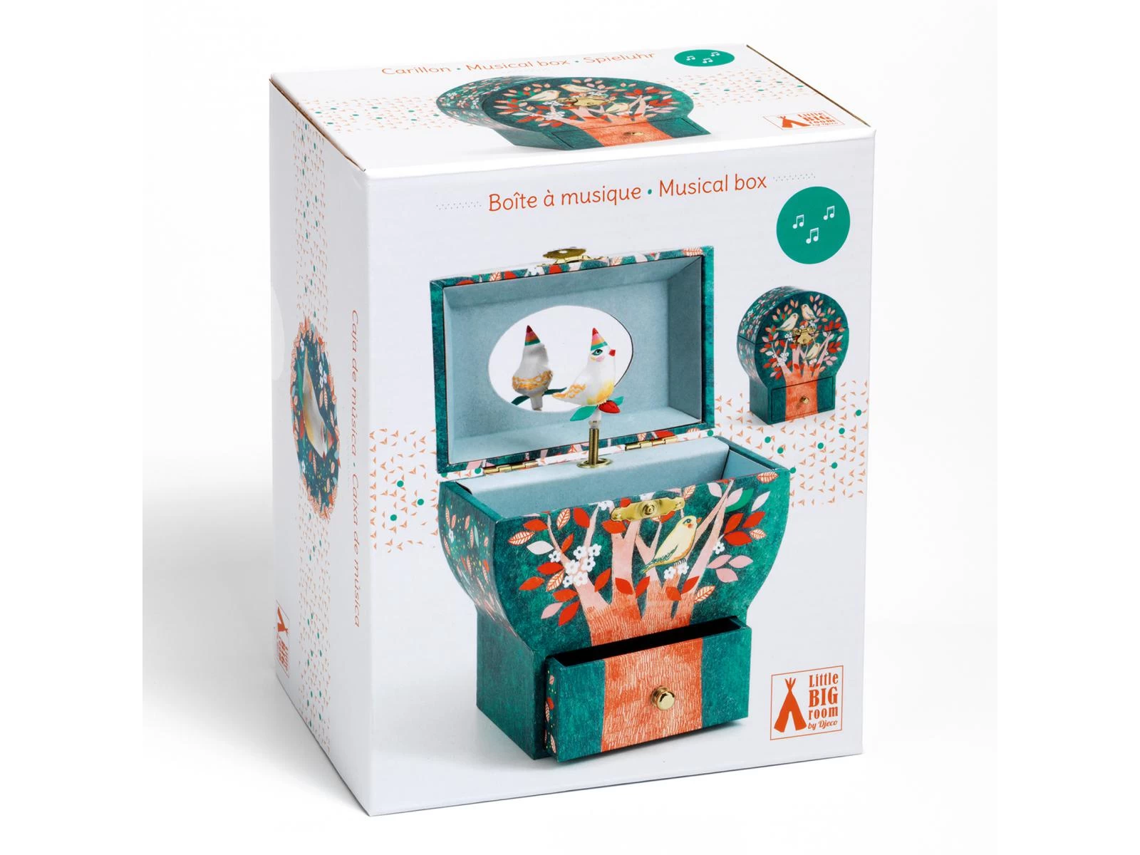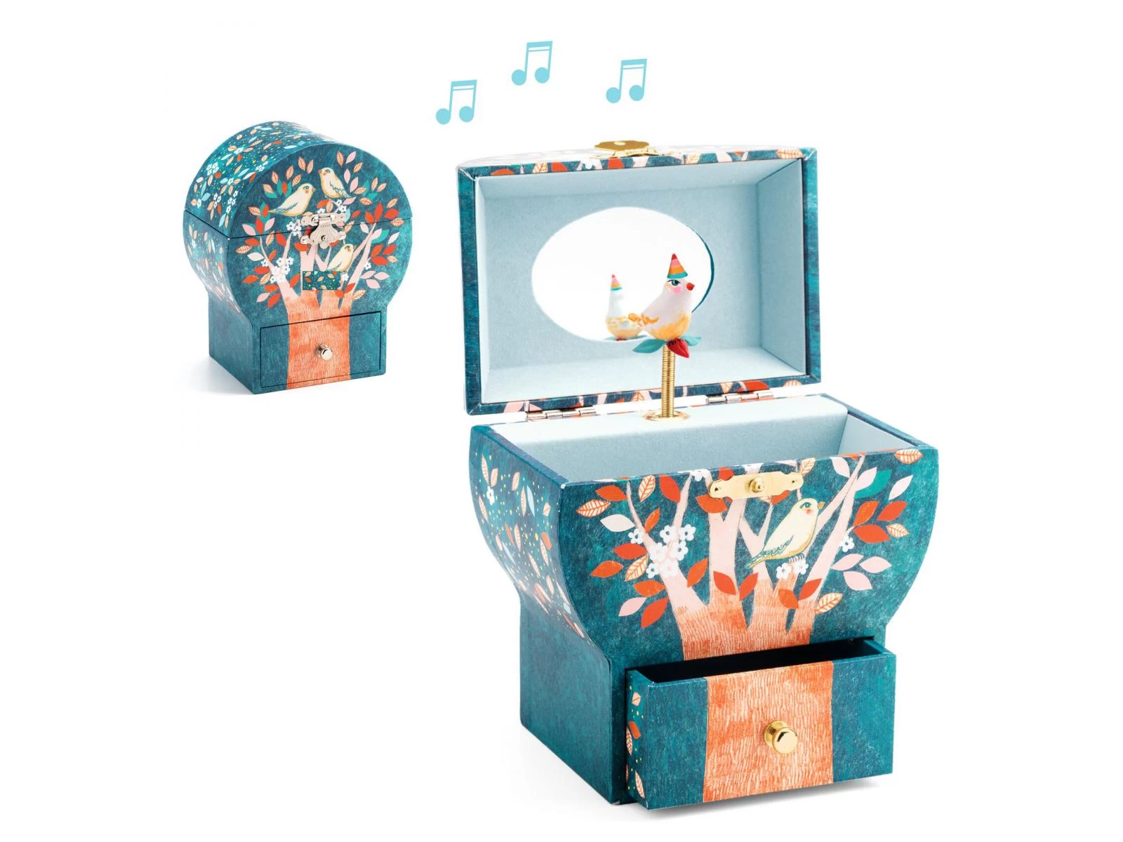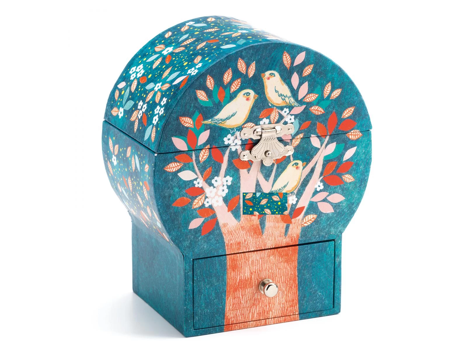 Arbre poétique est une boîte à musique silhouettée joliment illustrée avec un tiroir pour ranger ses bijoux et secrets. Tournez la clé, ouvrez la boîte et tout s’anime ! Une jolie figurine finement sculptée tourne et se reflète sur un miroir silhouetté au son de la musique « Santa Lucia » de Johann Strauss.