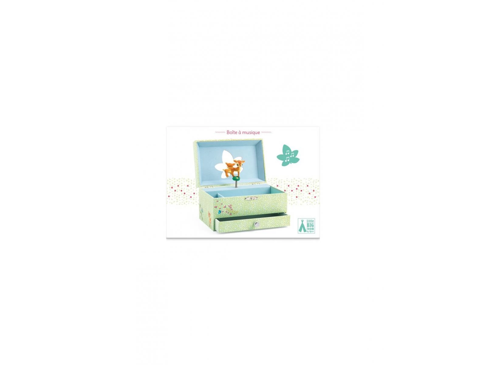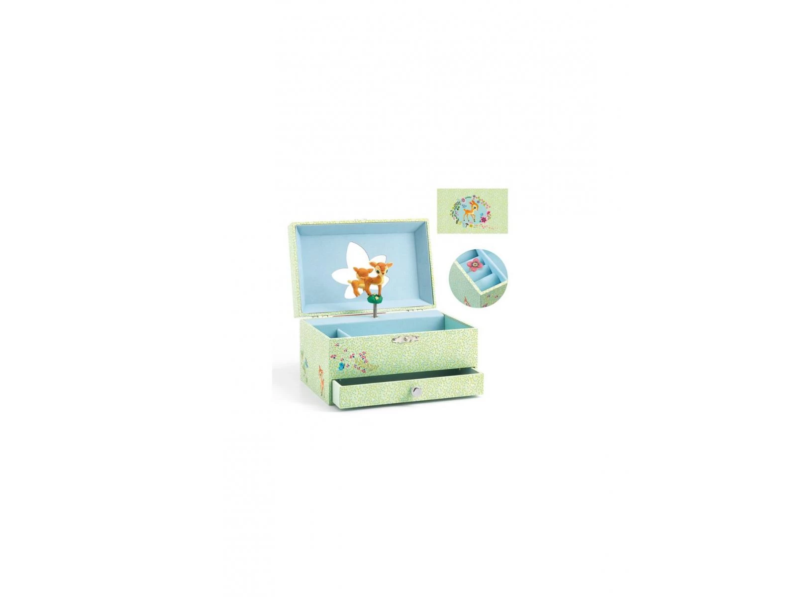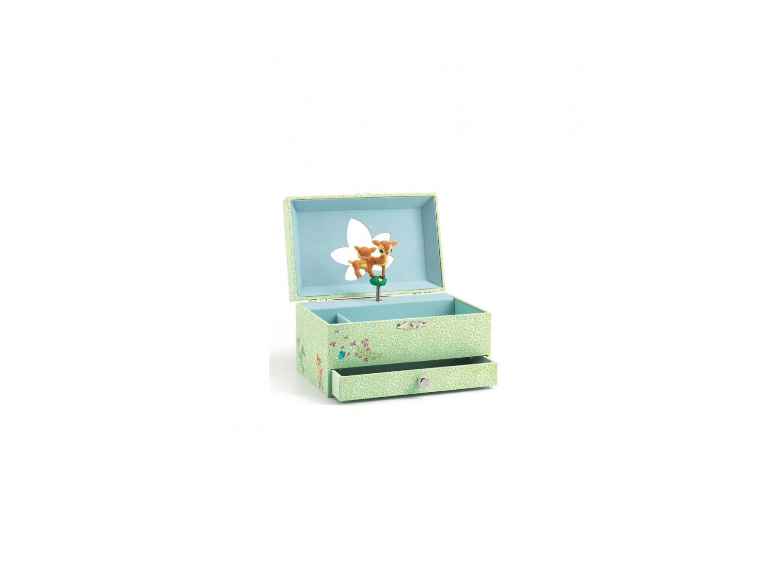 La chanson du faon est une boîte à musique avec un tiroir pour ranger ses bijoux et secrets. Tournez la manivelle, ouvrez la boîte et surprise : un faon finement sculpté tourne et se reflète sur un miroir silhouetté au son de la musique Histoires de la forêt viennoise» de Johann Strauss.