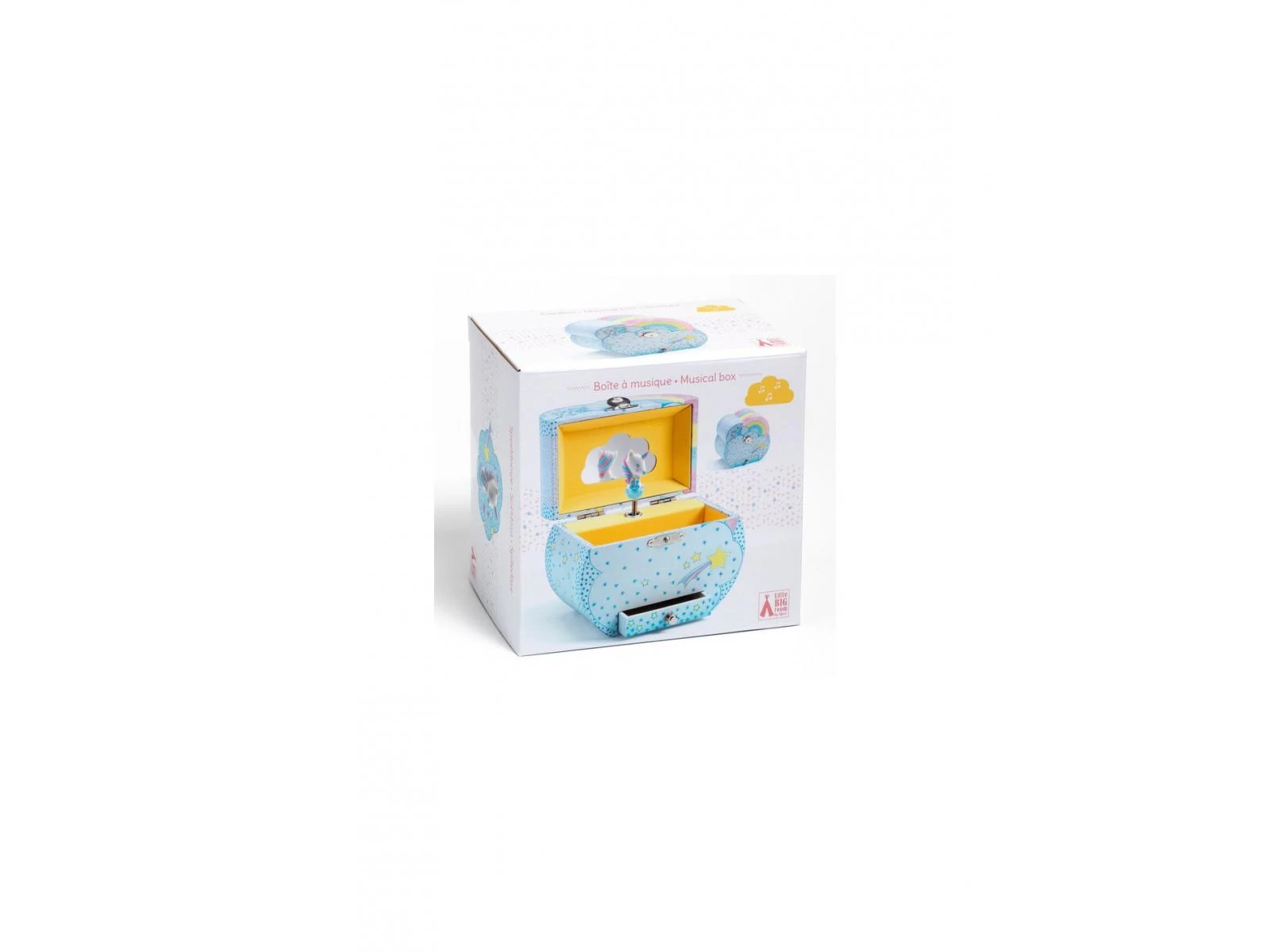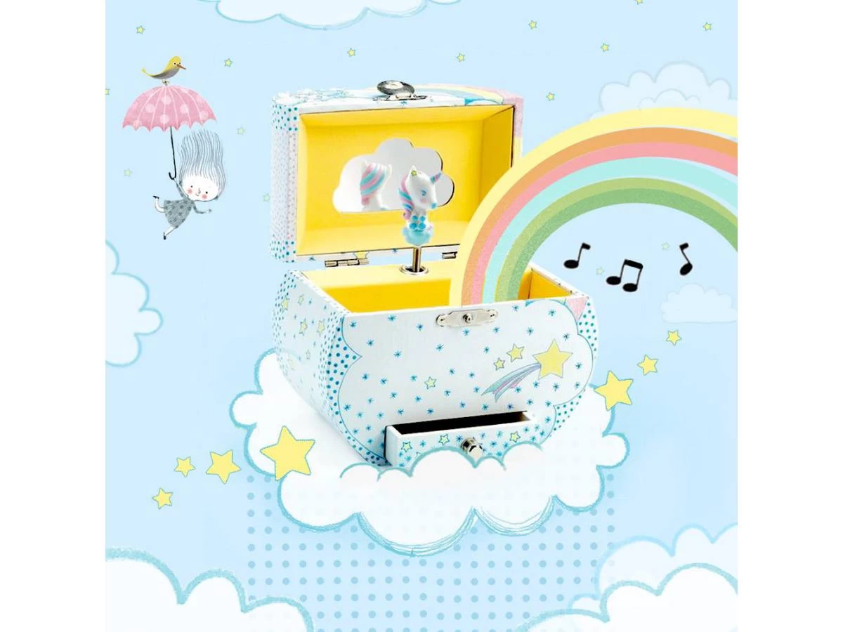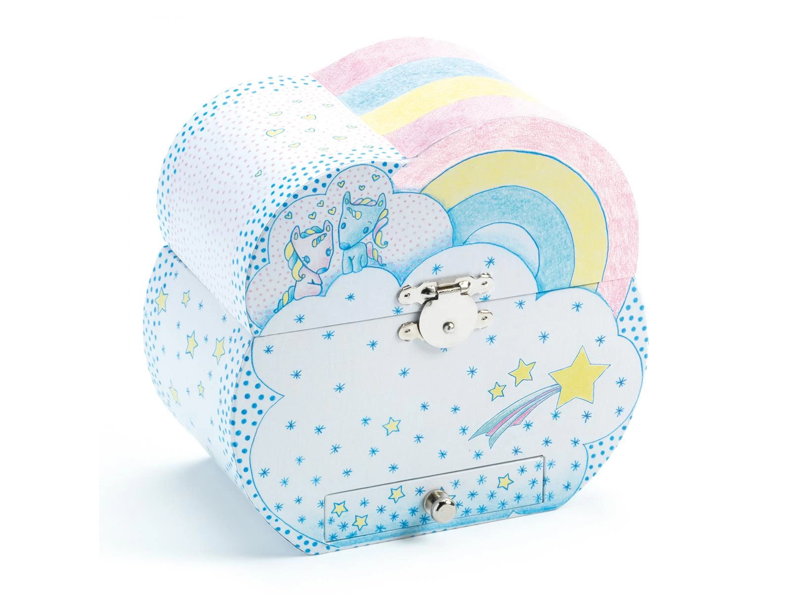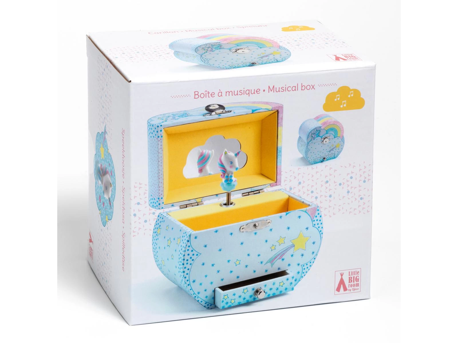 Rêves de licorne est une boîte à musique en forme de nuage joliment illustrée avec un tiroir pour ranger ses bijoux et secrets. Tournez la manivelle, ouvrez la boîte et surprise : une licorne finement sculptée tourne et se reflète sur un miroir silhouetté au son de la musique « Le Beau Danube bleu » de Johann Strauss.
