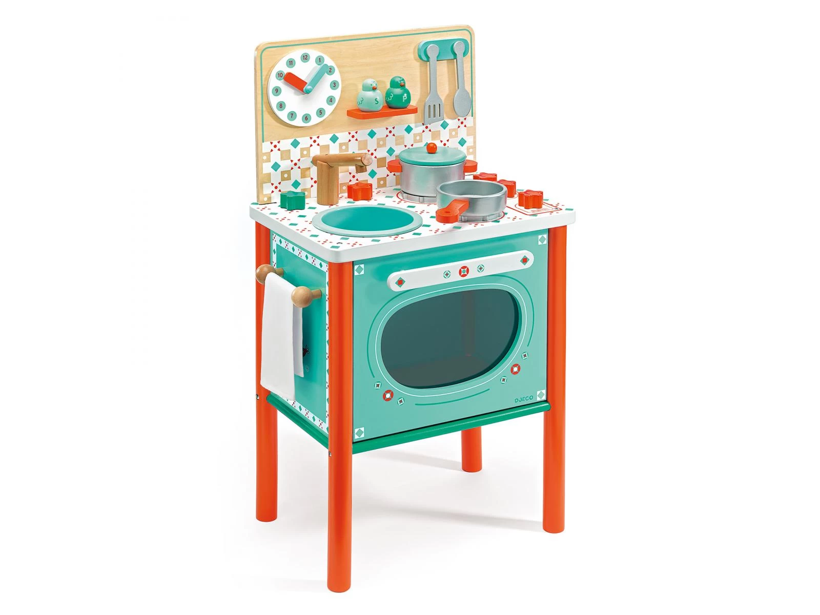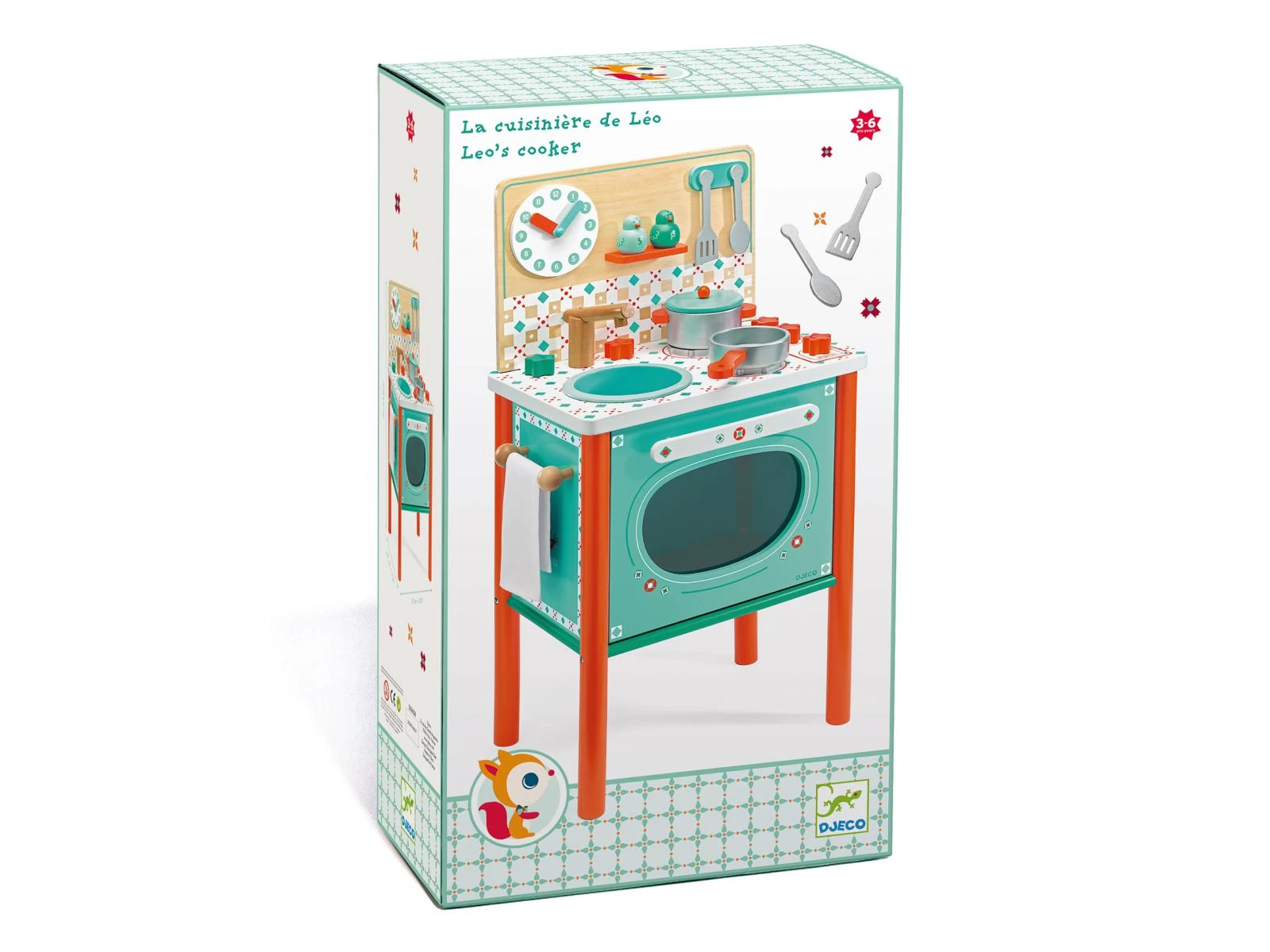 La cuisinière de Léo est une cuisinière en bois sur pieds pour cuisinier comme un grand. Cette cuisinière est entièrement équipée, avec son évier et son robinet, son four et ses deux plaques de cuisson : l’enfant peut cuisiner comme un chef en s’aidant des deux ustensiles et préparer de bons petits plats. L’horloge intégrée permet de surveiller le temps de cuisson. Ne pas oublier d’assaisonner son plat avant de le servir, une salière et une poivrière sont posées sur une petite étagère. Un jeu d’imitation complet et coloré.