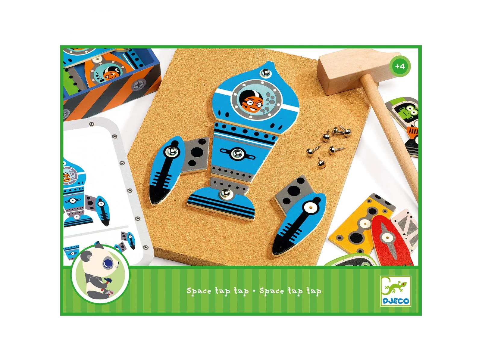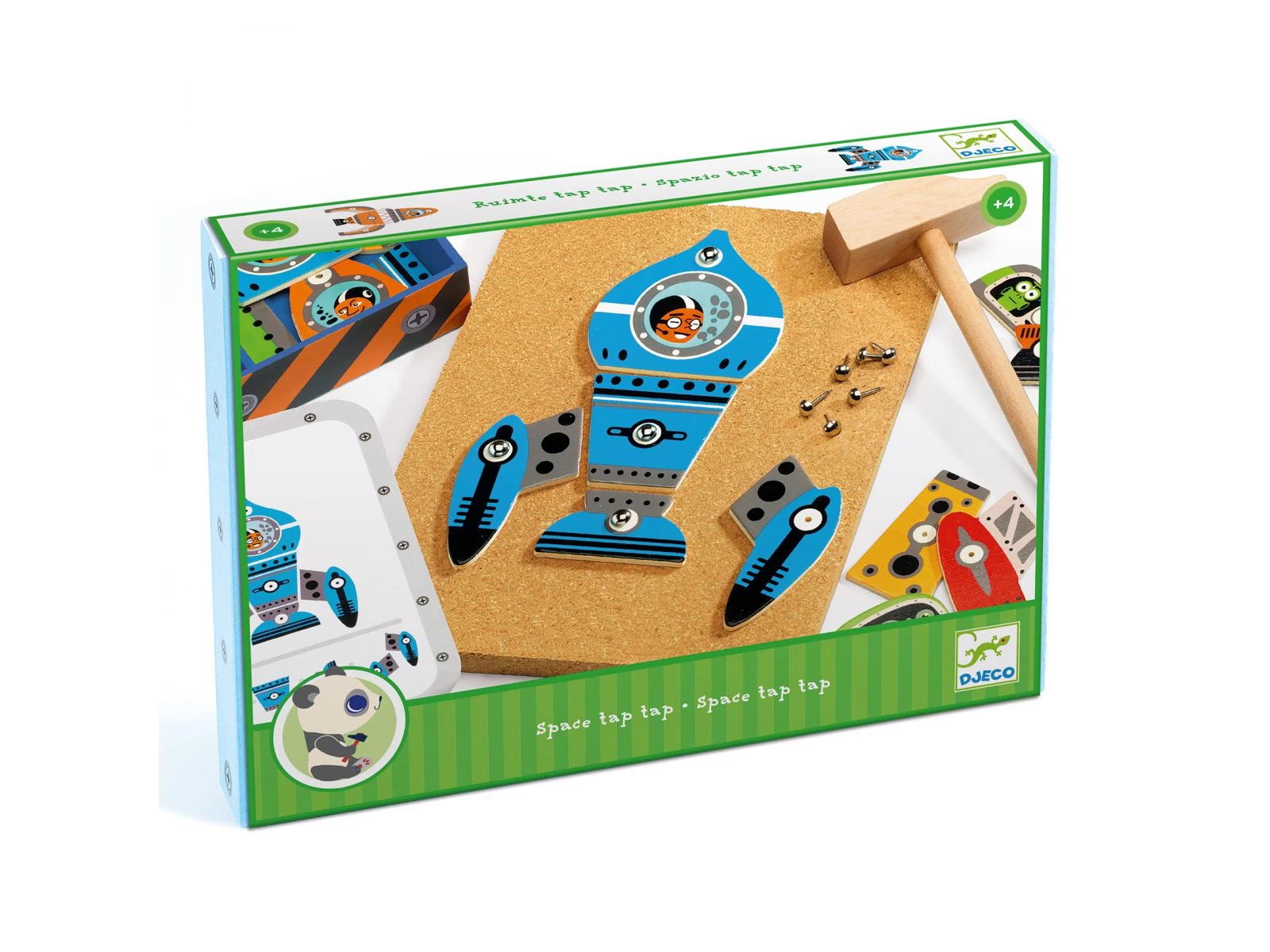 Tap tap Space, un classique des activités de maternelle revisité par Djeco pour développer la dextérité des plus jeunes. L’enfant construit ses propres fusées et navettes spaciales en plaçant les pièces sur le support en liège et en les fixant à l’aide des petits clous et du marteau. Il reproduit les modèles ou fait appel à son imagination pour créer ses propres navettes spatiales à l’infini ! Le tout dans une jolie boîte en bois !