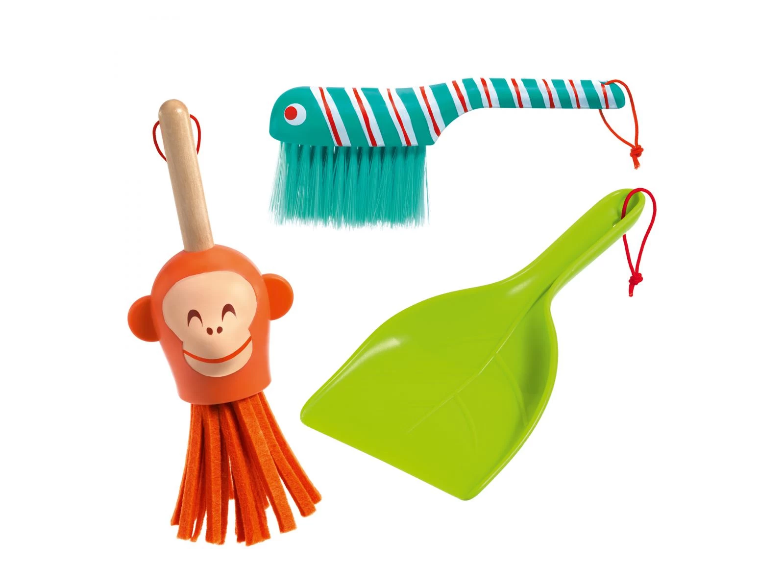 Un set de ménage fantaisiste sur le thème de la jungle facile à ranger. Balayette-serpent, pelle végétale, plumeau à dépoussiérer-singe… au travail les Mister Clean !
