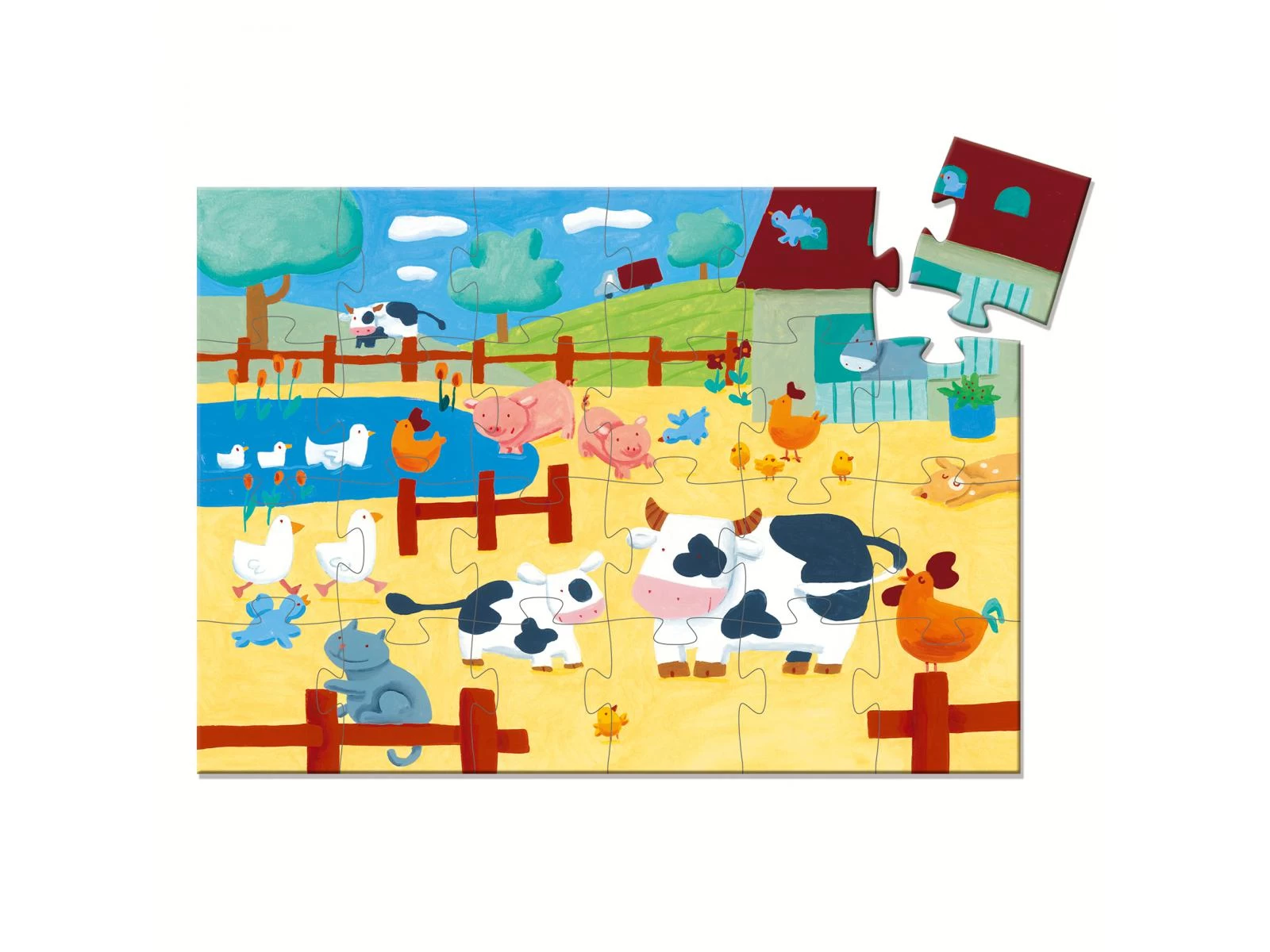 L’enfant découvre les animaux de la ferme. Un magnifique puzzle de 24 pièces dans une boîte élégante en forme de vache.