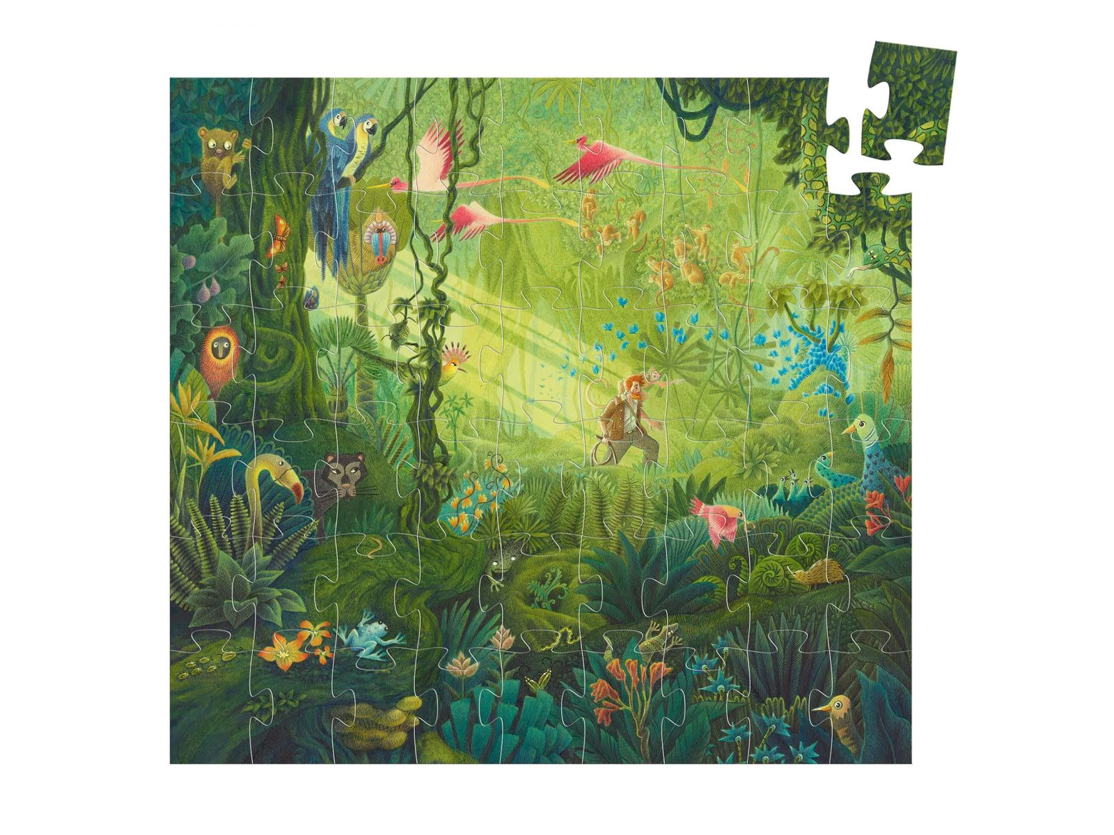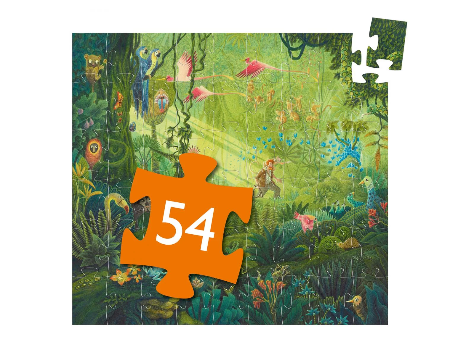 Un aventurier traverse une jungle tropicale remplie d’animaux et de plantes exotiques. Un magnifique puzzle de 54 pièces présenté dans une jolie boîte silhouette.