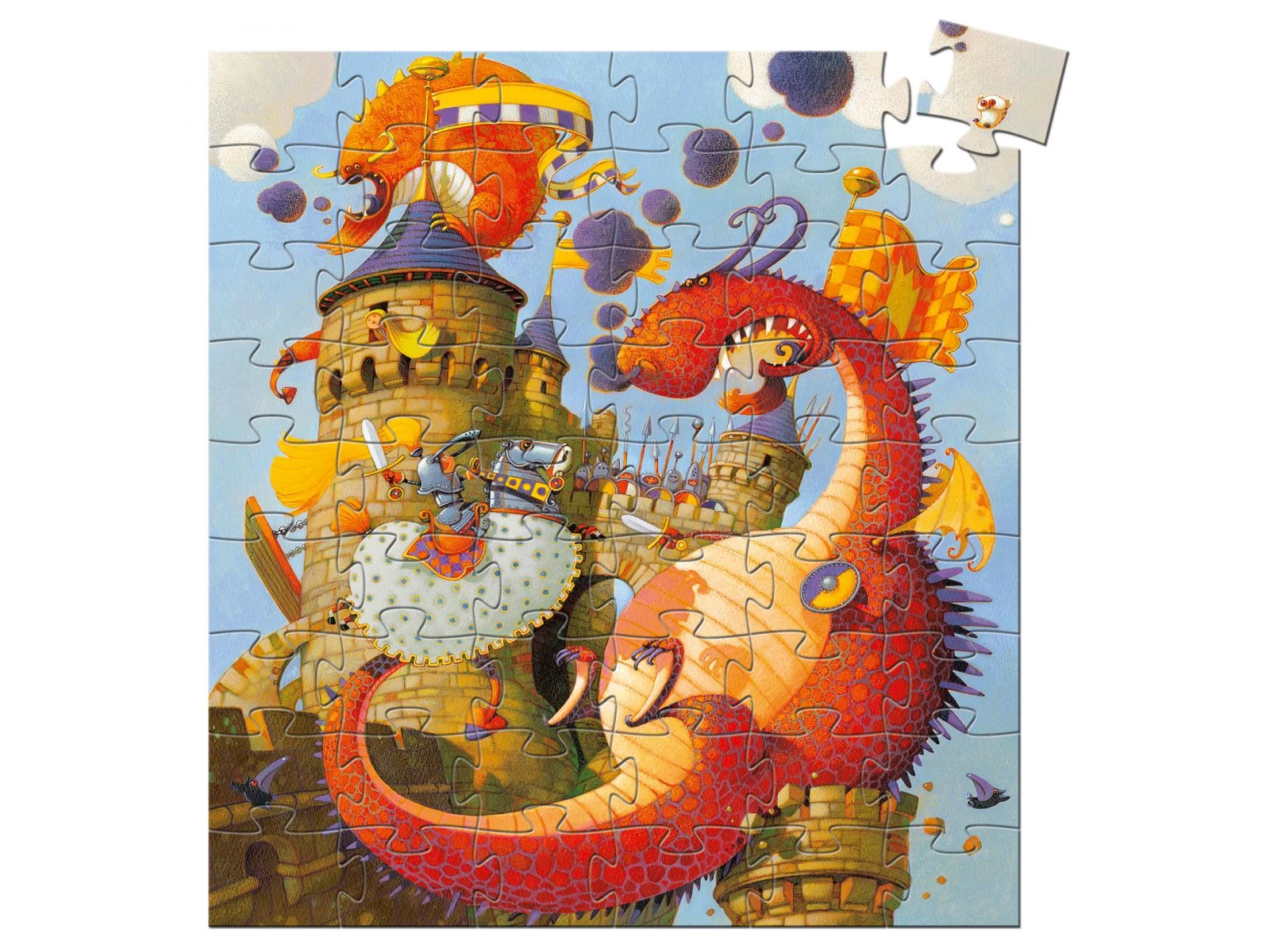 Le chevalier Vaillant combat les dragons pour sauver la princesse dans le château. Un magnifique puzzle de 54 pièces dans une boîte élégante en forme de château.