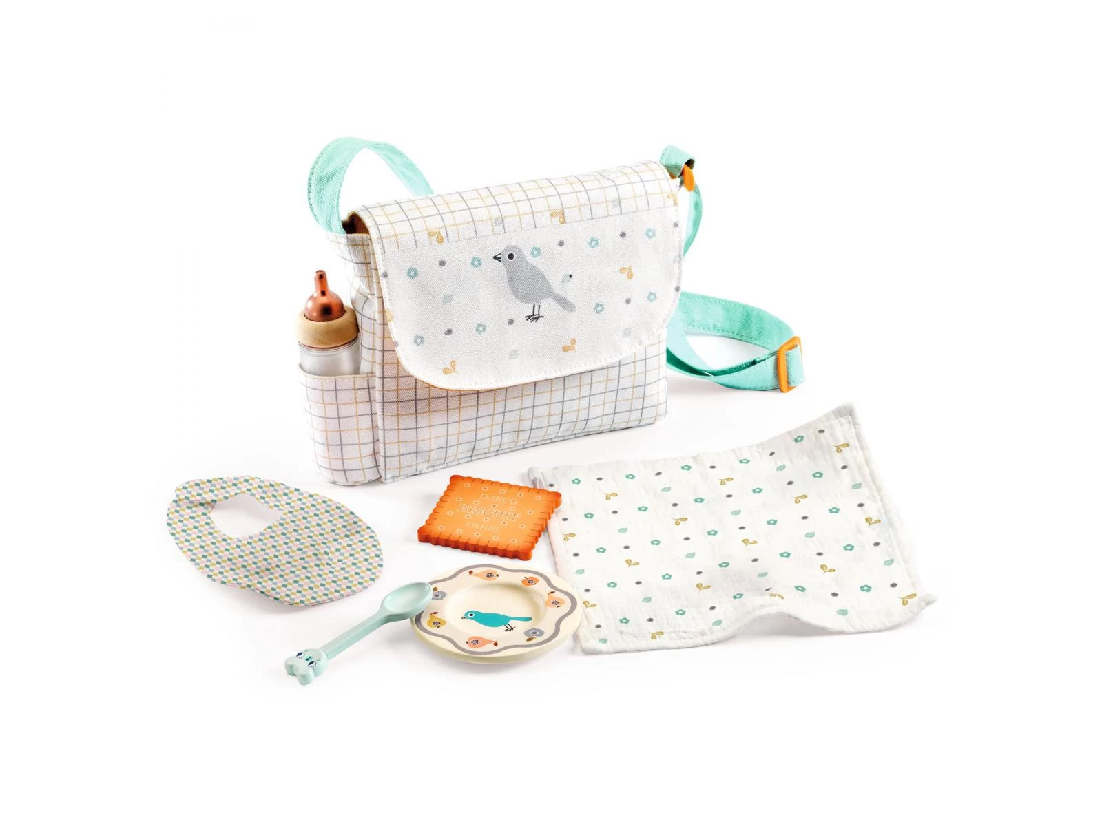 A table ! Voici un sac qui contient tout le nécessaire pour passer un bon moment lors du repas avec son bébé : un biberon, un biscuit, une cuillère, une assiette, un bavoir et un lange pour lui faire faire son petit rot sur les épaules… Un joli sac en tissu épais avec sa poche biberon sur le côté permet de tout ranger et de partir en promenade sans rien oublier.