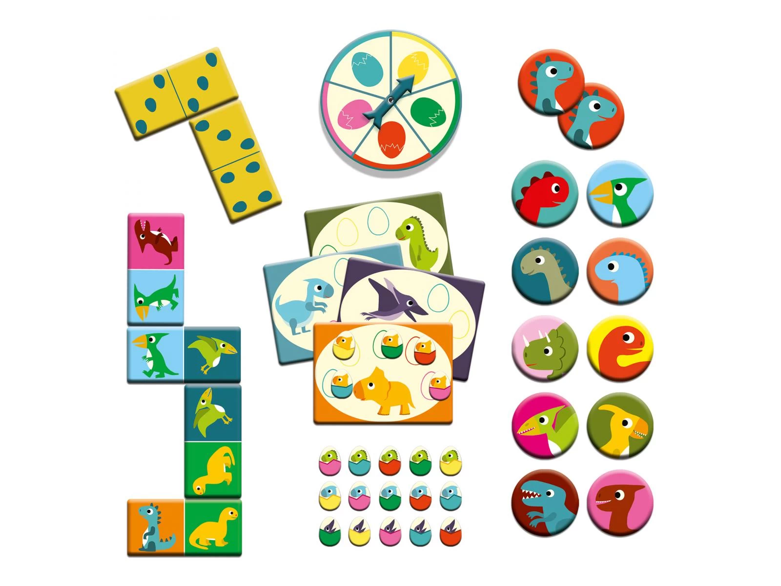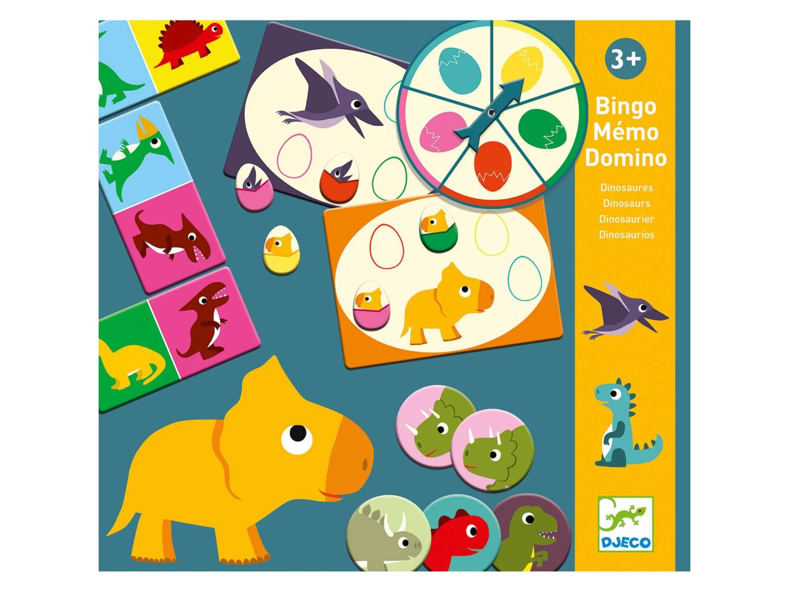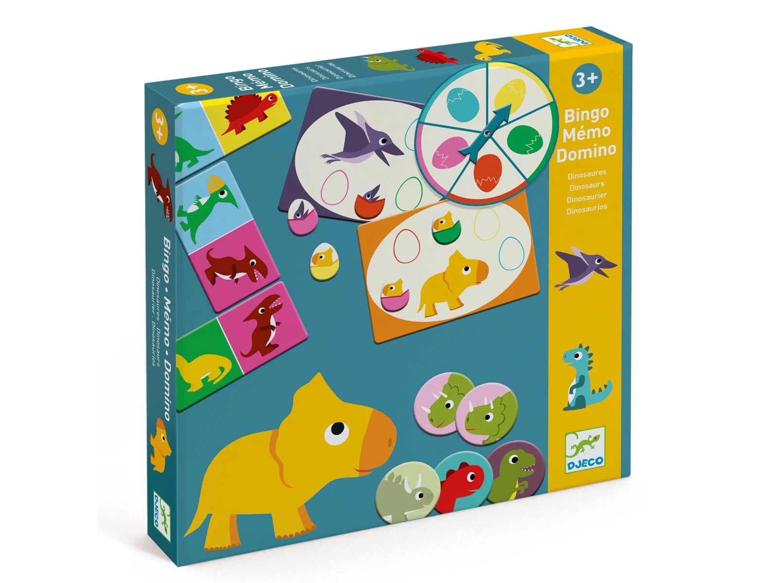 Un coffret complet contenant 3 jeux éducatifs : un mémo, un bingo et un domino avec des illustrations sur le thème des dinosaures.