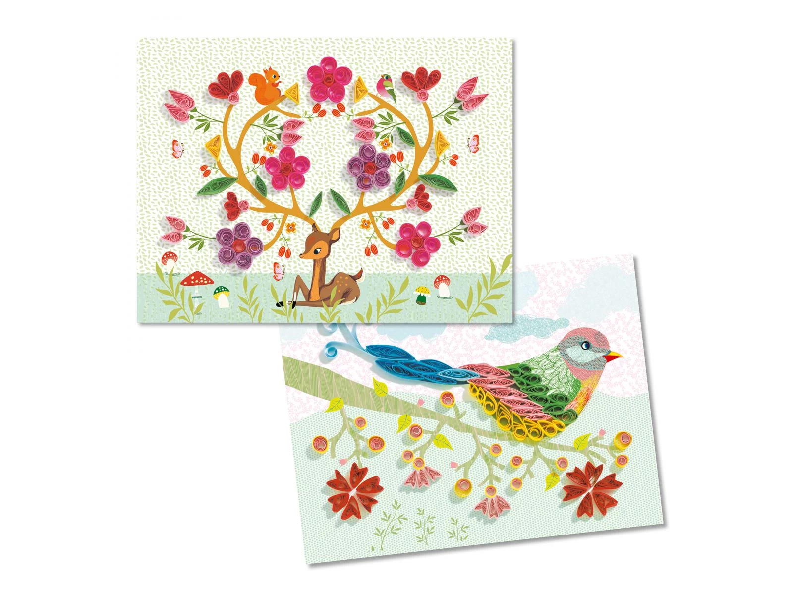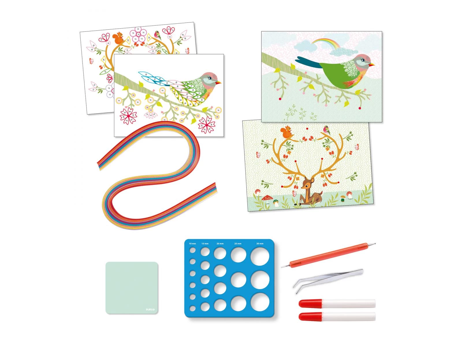 Ce coffret propose aux enfants de découvrir l’art du « quilling » ou « paperolles », grand classique du craft consistant à composer des tableaux avec des spirales de papier. Des outils adaptés et une technique simplifiée permettent à l’enfant de compléter facilement les 2 tableaux proposés. Il enroule les bandelettes multicolores pour former boucles, cercles et autres navettes, puis les colle sur les fonds illustrés. Le plumage de l’oiseau et les bois du cerf se parent de motifs spiralés tout en volume.