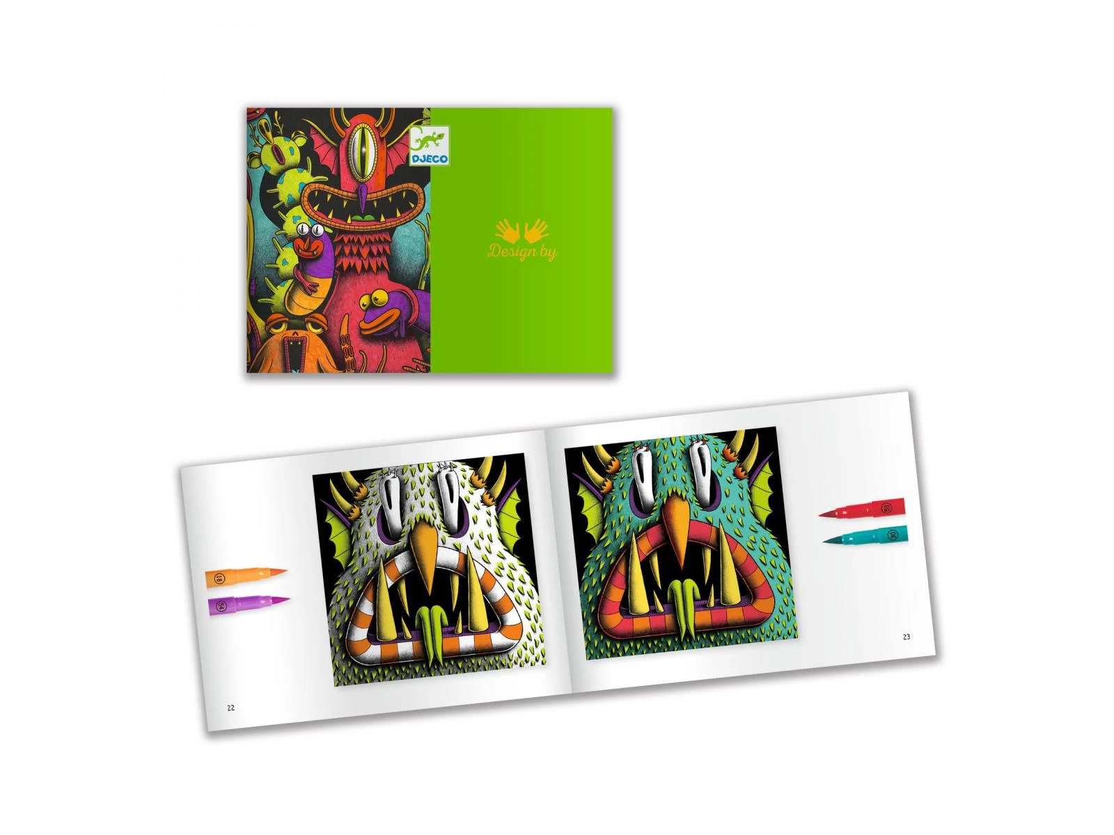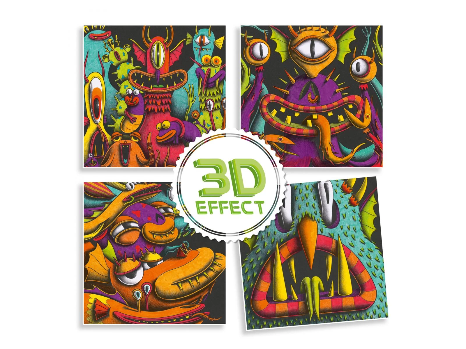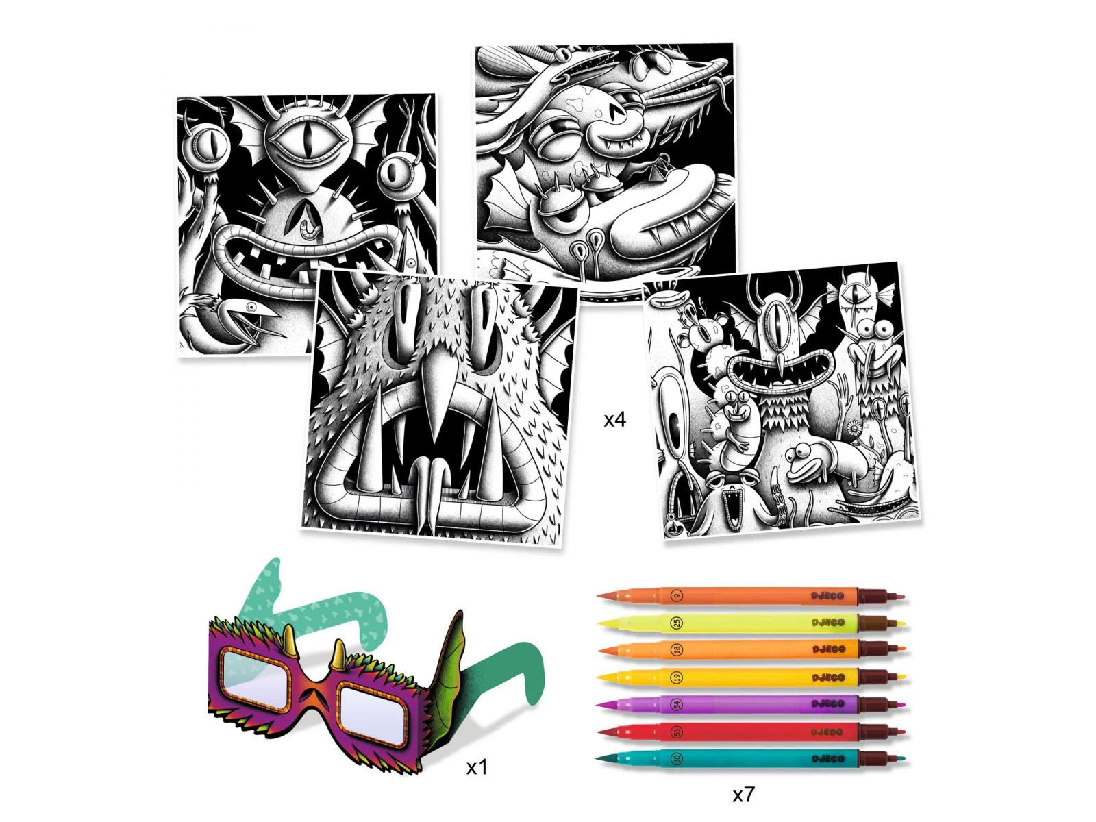 Un coffret de coloriage sur le thème des monstres comprenant 4 tableaux à compléter. Muni de ses feutres pinceaux, l’enfant suit pas à pas les indications de l’artiste pour mettre les illustrations en couleurs. Une fois l’activité terminée, il chausse ses lunettes 3D… Stupéfiant ! Les illustrations prennent vie : les couleurs chaudes apparaissent au premier plan et les froides sur le fond.