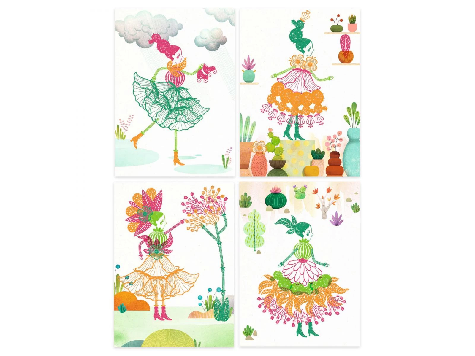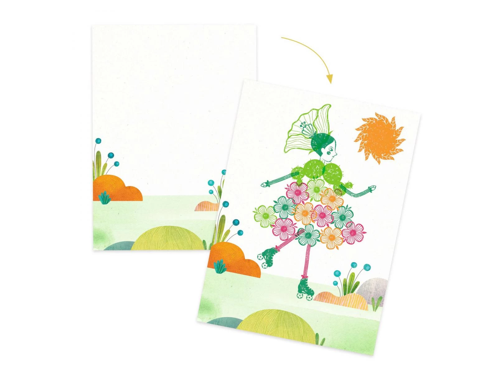 Un coffret de tampons où l’enfant compose ses propres personnages en associant les formes et variant les couleurs pour créer de jolies tenues fleuries. Progressivement, il encre les tampons et marque les empreintes pour animer les décors proposés. L’enfant s’amuse à modifier les combinaisons en laissant libre cours à son imagination. Toujours différentes, les décors prennent vie !