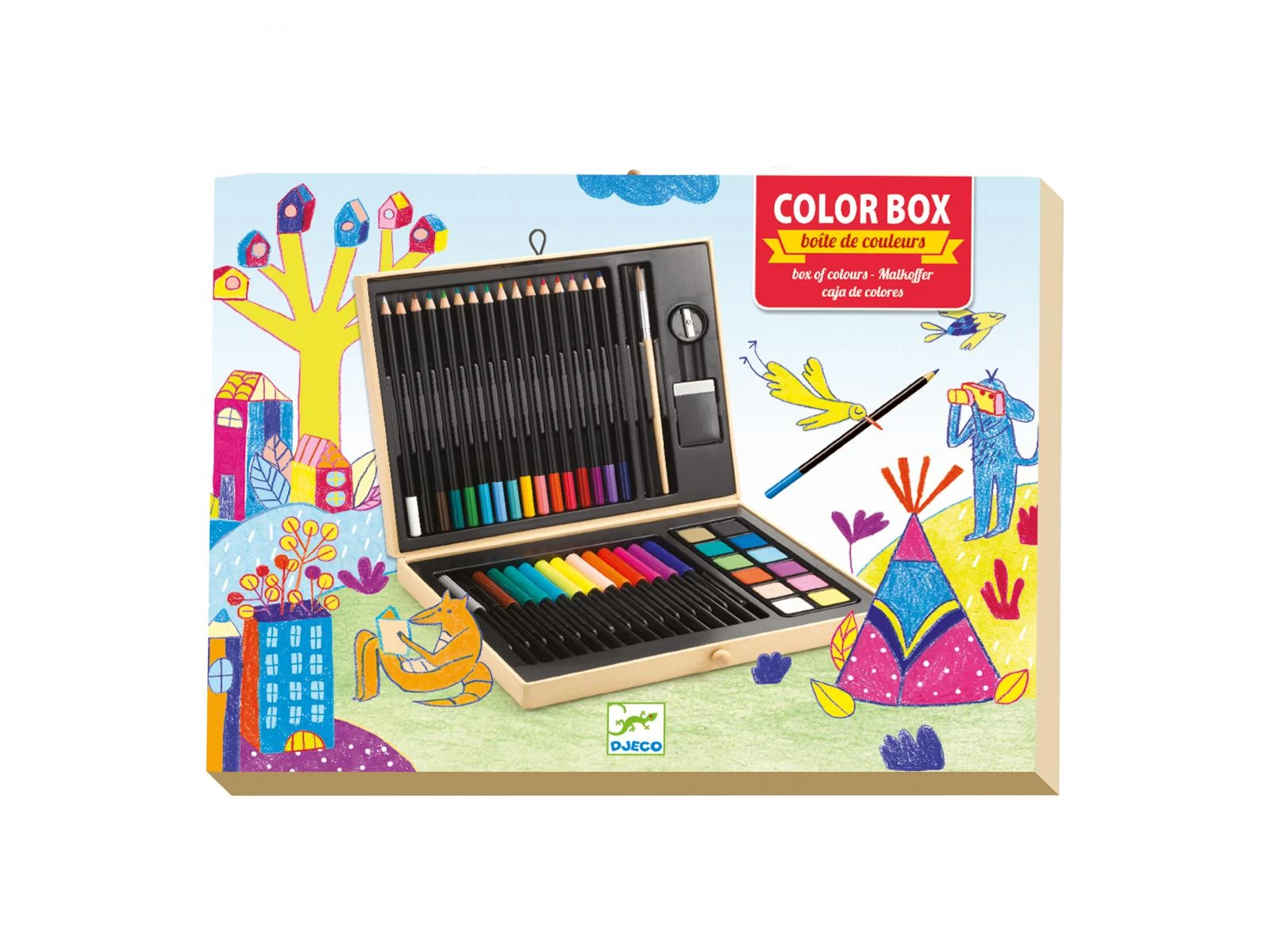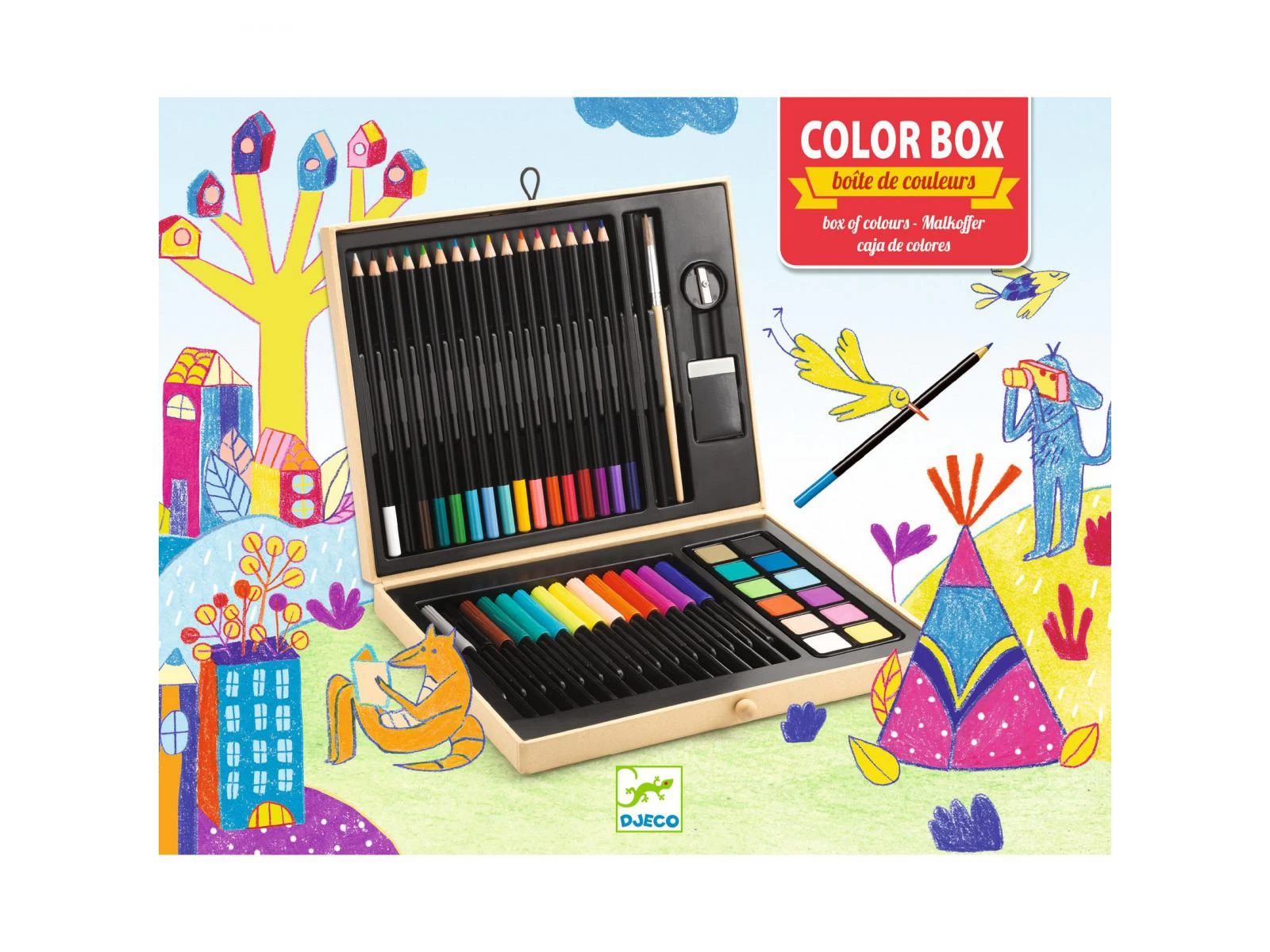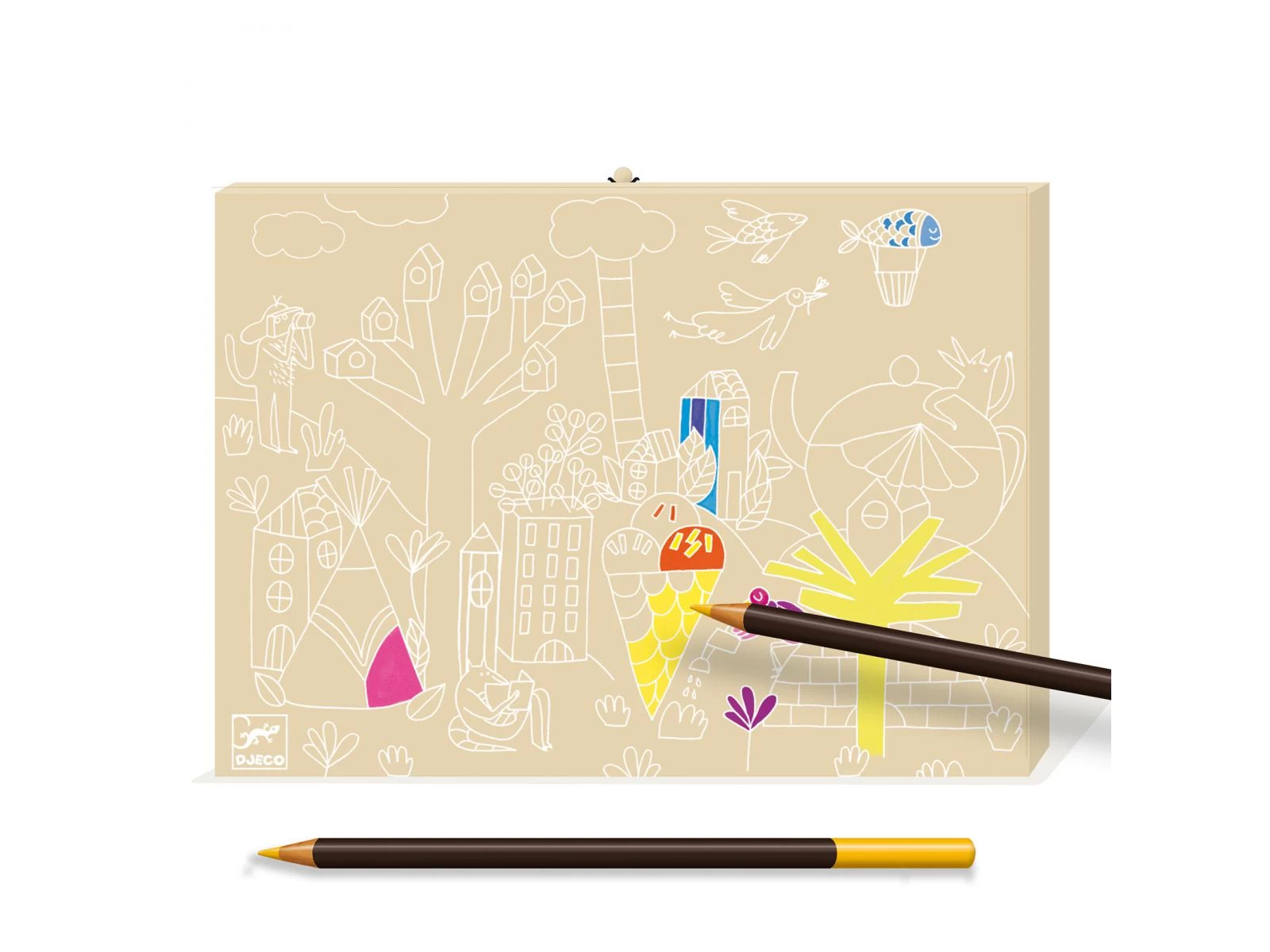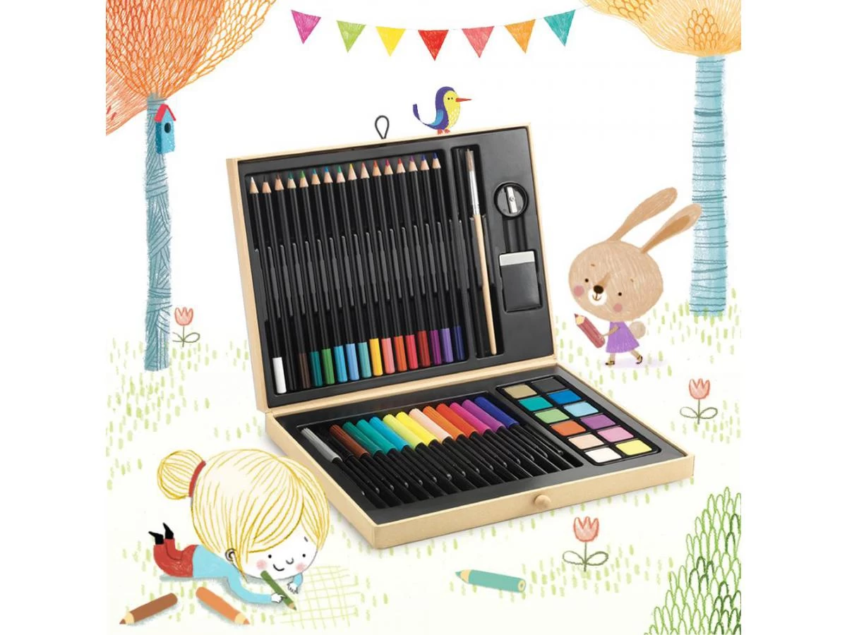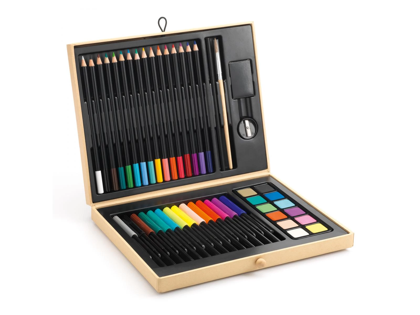 Une mallette compacte à emporter partout contenant tout le nécessaire pour colorier, peindre et dessiner. En papier craft brut, l’extérieur de la mallette est orné d’une frise à mettre en couleurs pour la personnaliser. Voici un beau cadeau pour les artistes en herbe !