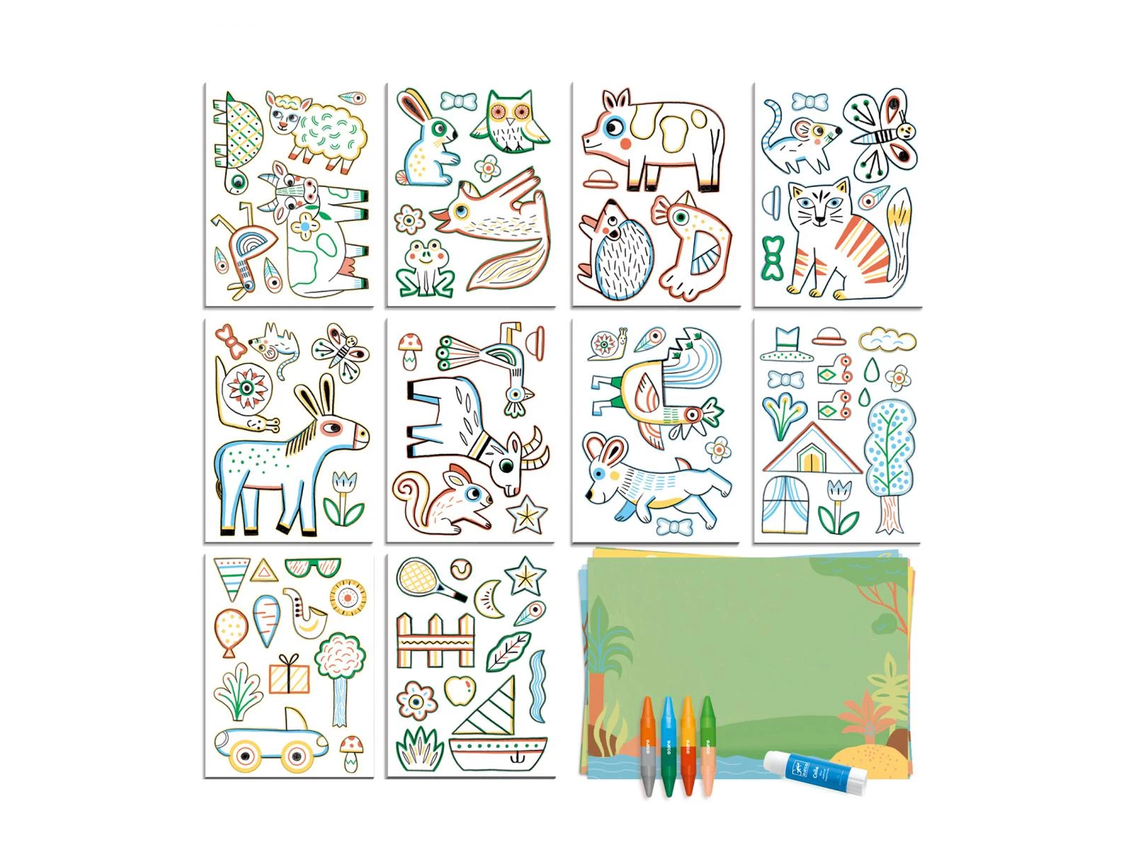 Un coffret créatif sur le thème des animaux. Une multitude de formes en carton épais à colorier et à coller sur les 6 grands décors. Le livret pas à pas propose à l’enfant quelques modèles.