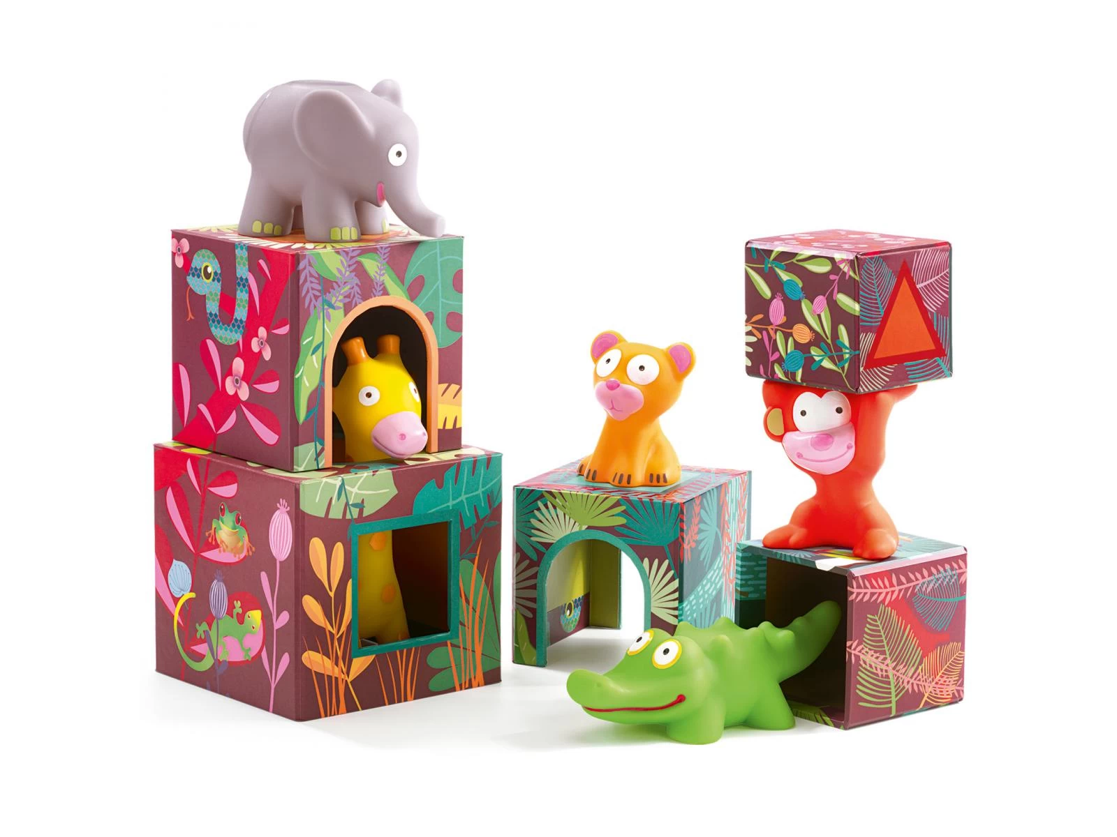 5 cubes illustrés et 5 très gros animaux pour jouer et construire dans un décor de jungle. Une grande jouabilité : l’enfant peut empiler les cubes en carton pour créer une tour ou les emboîter. Il peut aussi jouer au sol et recréer de nombreux décors, ou encore jouer avec les animaux seuls. De belles histoires à inventer avec ce jeu très complet.