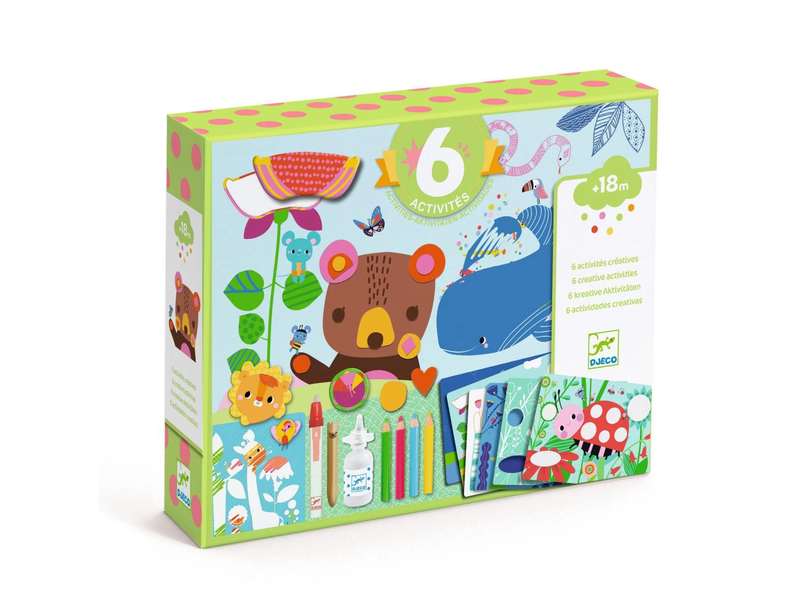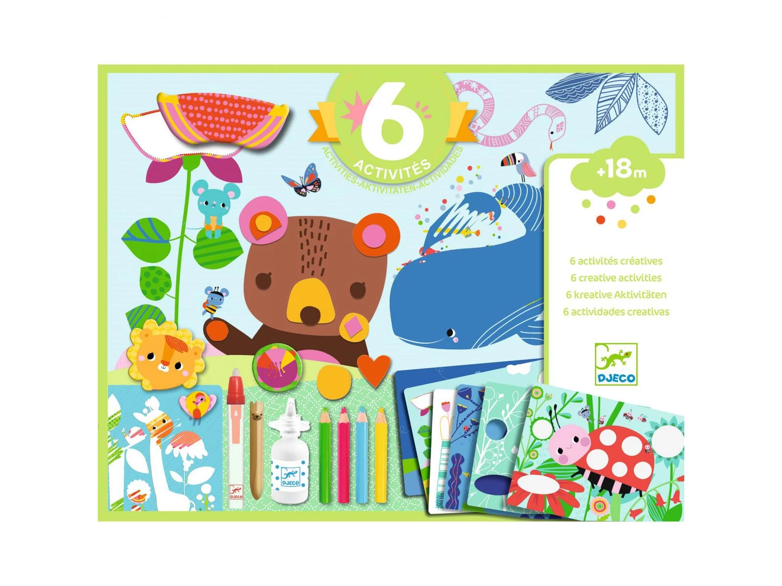 Voici un coffret très complet proposant 6 activités créatives et de nombreux projets pour des enfants dès 18 mois. Collage, coloriage, carte à gratter… Il y en a pour tous les goûts ! Des heures d’activités manuelles pour découvrir différentes techniques de création. Tous les accessoires sont fournis pour que l’enfant réalise chacune des activités au rythme de ses envies et de sa curiosité. Le livret détaillant pas à pas chacune des réalisations le guidera dans ses créations.