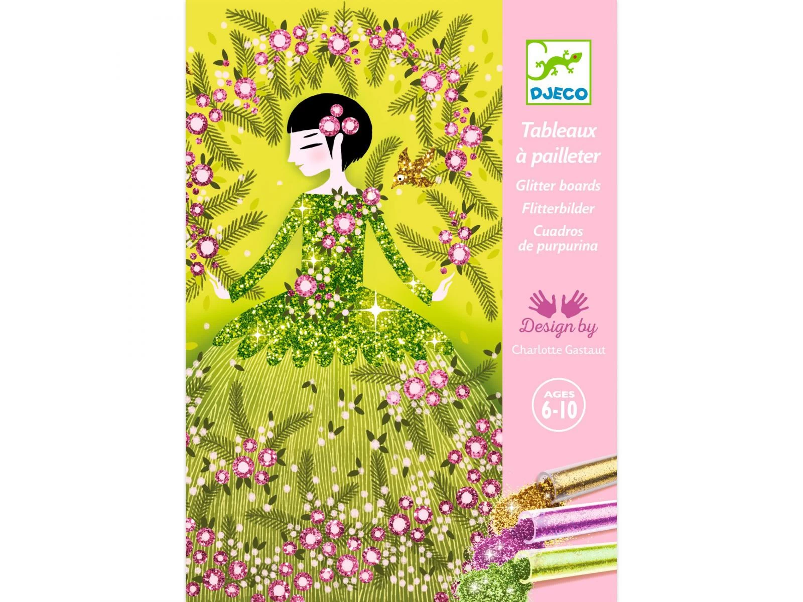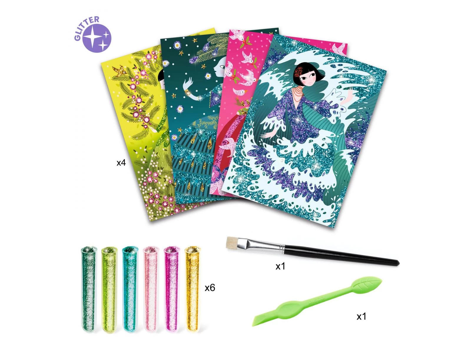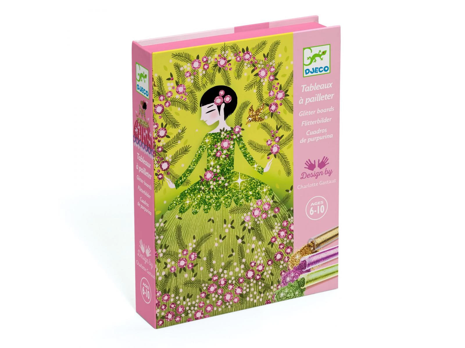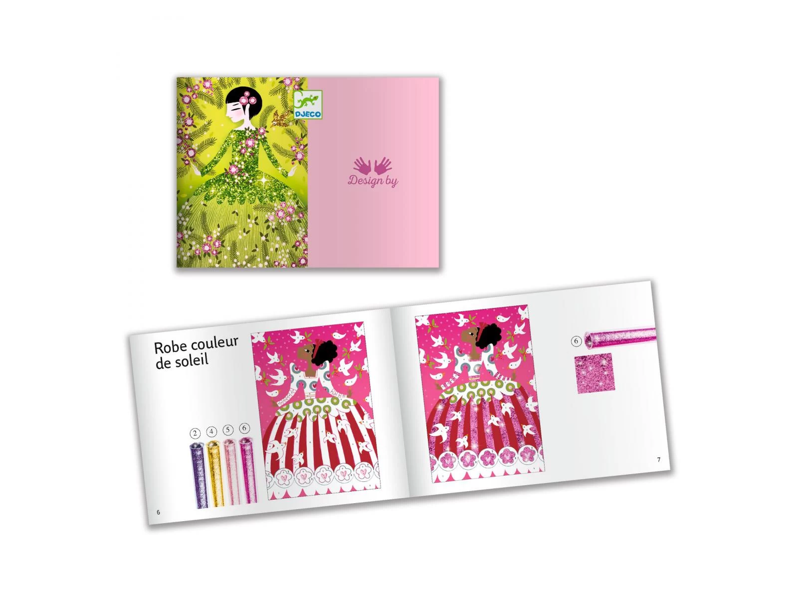 4 tableaux présentant de jolies robes à illuminer de paillettes colorées. L’enfant place son tableau dans la boîte, il dévoile les zones préencollées grâce à l’outil fourni, puis les saupoudre de poudre pailletée en suivant le code couleur indiqué dans le livret. Une fois l’activité terminée, les robes étincellent et s’illuminent avec le plus grand raffinement.
